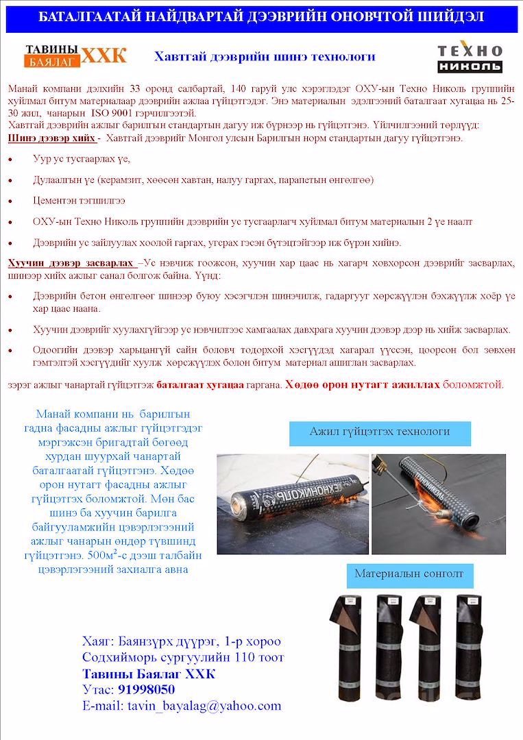 Бүх төрлийн хавтгай дээврийн ажил болон гадна фасадны ажил гүйцэтгэнэ
