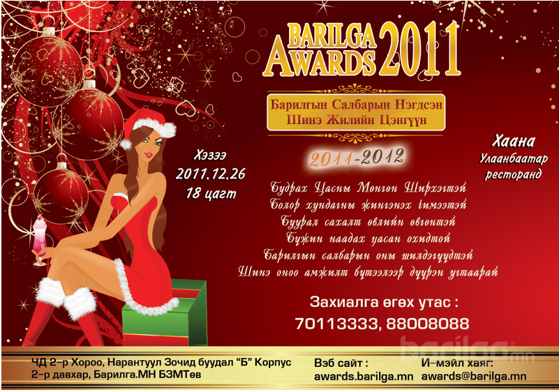 “Барилга Авардс-2011” барилгын салбарын нэгдсэн шинэ жилийн цэнгүүнд эх орны хөгжилд голлох үүрэг гүйцэтгэсэн аж ахуйн нэгж, компаниуд оролцож 2011 онд хийсэн бүтээн босголт, амжилтаа дүгнэн цэгнэж шилдэгүүдээ шалгаруулах юм.