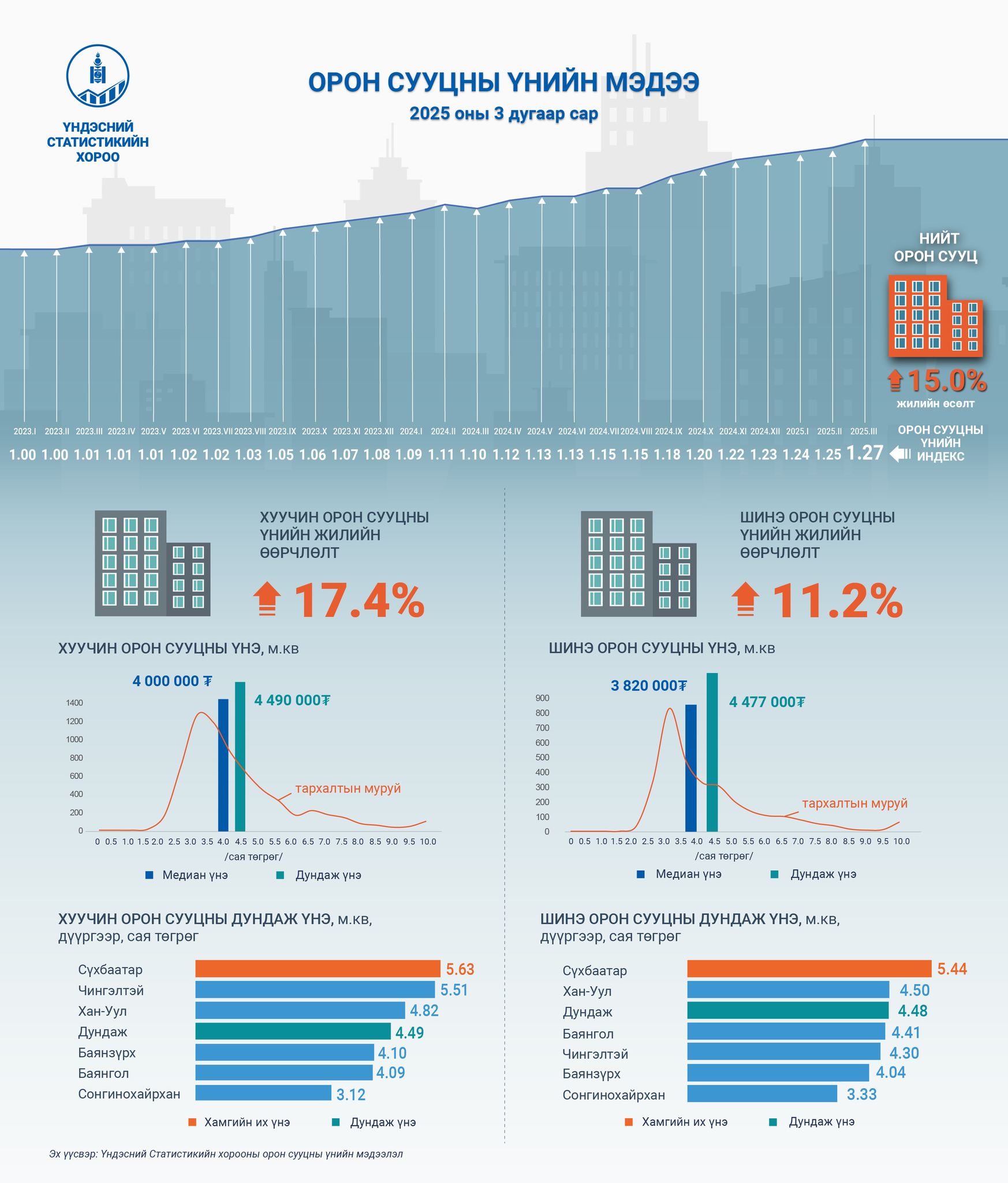 2025 оны гуравдугаар сард хуучин орон сууцны 1 метр квадрат талбайн дундаж үнэ 4.49 сая төгрөг болж, Сүхбаатар дүүрэгт хамгийн өндөр буюу 5.63 сая төгрөгийн үнэтэй байна. Хуучин орон сууцны дундаж үнэ өмнөх оны мөн үетэй харьцуулахад Чингэлтэй дүүрэгт 37.0 хувь (1 486 .4 мянган төгрөг)-өөр өссөн нь хамгийн өндөр, Хан-Уулдүүрэгт 16.3 хувь (676.4 мянган төгрөг)-өөр өссөн нь хамгийн бага дүнг үзүүлжээ.