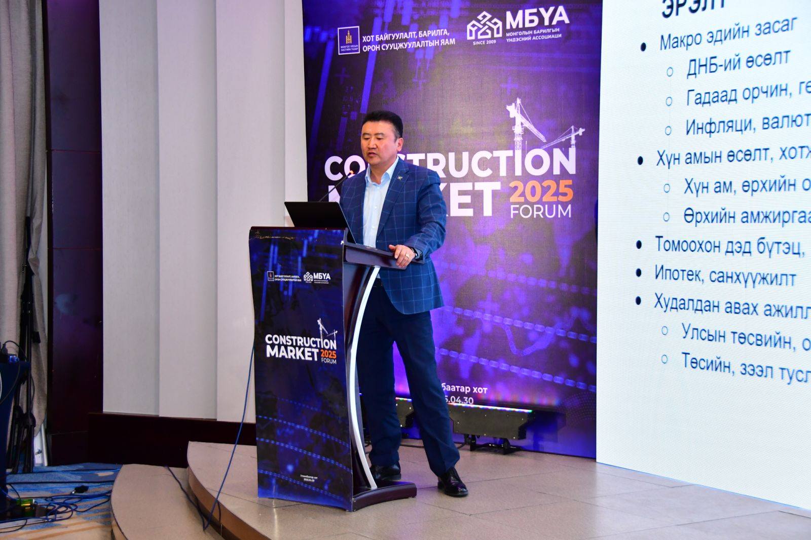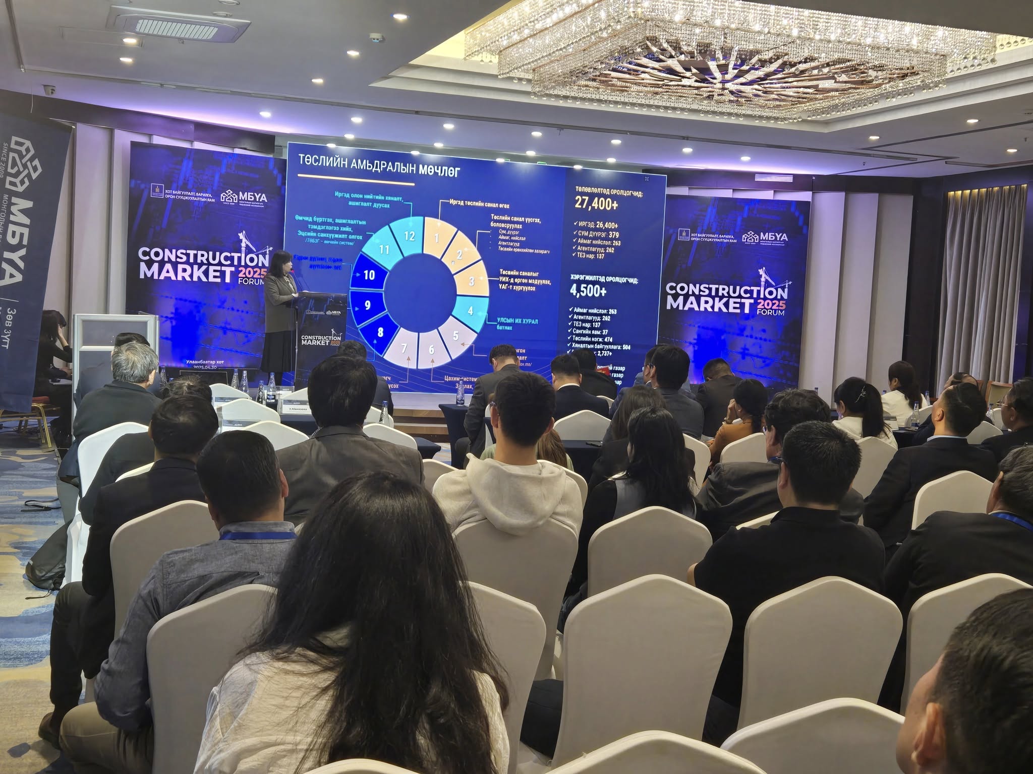 Монгол Улсын эдийн засгийн нөхцөл байдал барилга, бүтээн байгуулалтын салбарт хэрхэн нөлөөлж буй, барилгын салбарын зах зээлийн нөхцөл байдал, санхүүжилт, гаднын хөрөнгө оруулалт болон судалгааны нэгдсэн мэдээлэл хүргэх зорилгоор "Construction market 2025" форумыг Монголын Барилгын Үндэсний Ассоциаци ТББ Хот Байгуулалт, Барилга, Орон Сууцжуулалтын Яамтай хамтран дөрөвдүгээр сарын 30-ны өдөр зохион байгууллаа. Уг арга хэмжээнд төр болоод хувийн хэвшлийн төлөөллүүд, барилга бүтээн байгуулалтын хөрөнгө оруулагчид, барилга угсралт, зураг төсөл, архитектур дизайн, материал үйлдвэрлэгч, ханган нийлүүлэгч зэрэг барилгын салбарын 250 орчим оролцогчид оролцсон юм.
