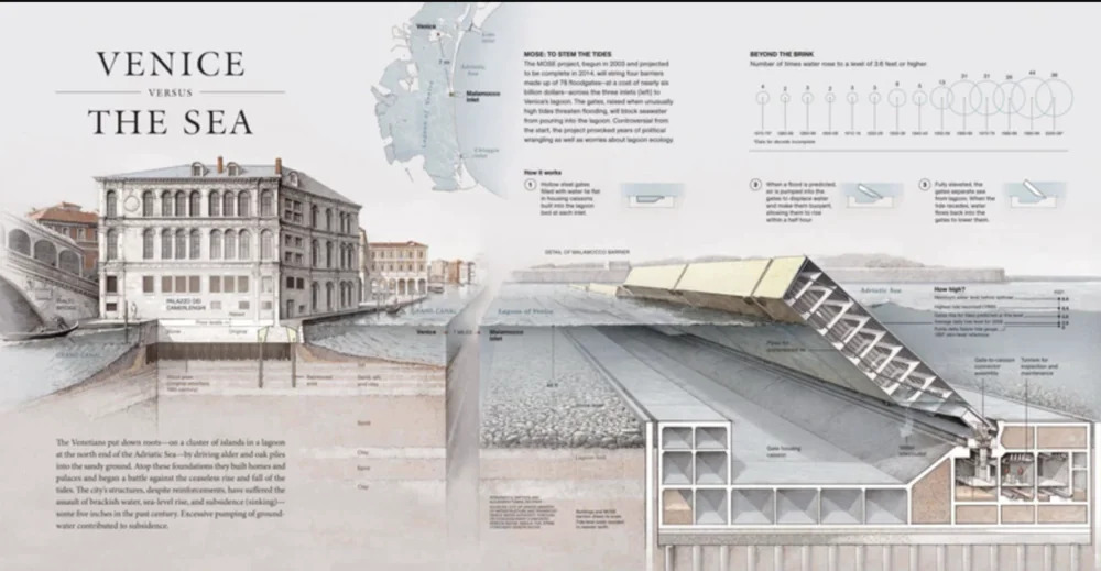 Венецийн MOSE (Modulo Sperimentale Elettromeccanico) төсөл нь хотын лагуныг Адриатын тэнгисээс хамгаалах зорилготой хөдөлгөөнт хаалтуудын систем юм. Энэхүү систем нь өндөр усны түвшний үед хаалтуудыг дээшлүүлэн усны урсгалыг хааж, хотыг үерээс хамгаалдаг.