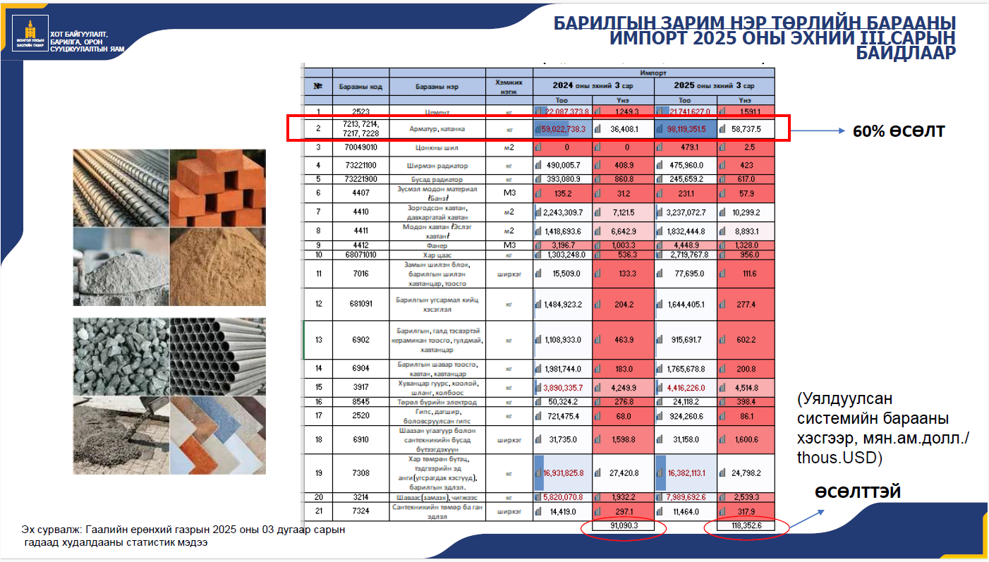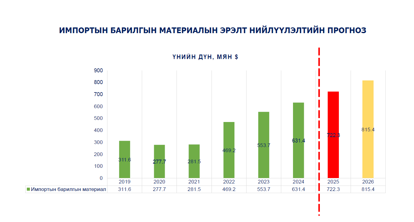 Эдгээр төслүүд хэрэгжиж эхэлснээр барилгын материалын эрэлт, нийлүүлэлт нэмэгдэнэ гэж үзэж байгаа бөгөөд импортын барилгын материалын эрэлт, нийлүүлэлтийн прогнозоос харвал 2025 онд өмнөх оноос 12,6 хувь, 2026 онд 22,7 хувь үнийн дүнгийн өсөлттэй байх төлөвтэй байна.