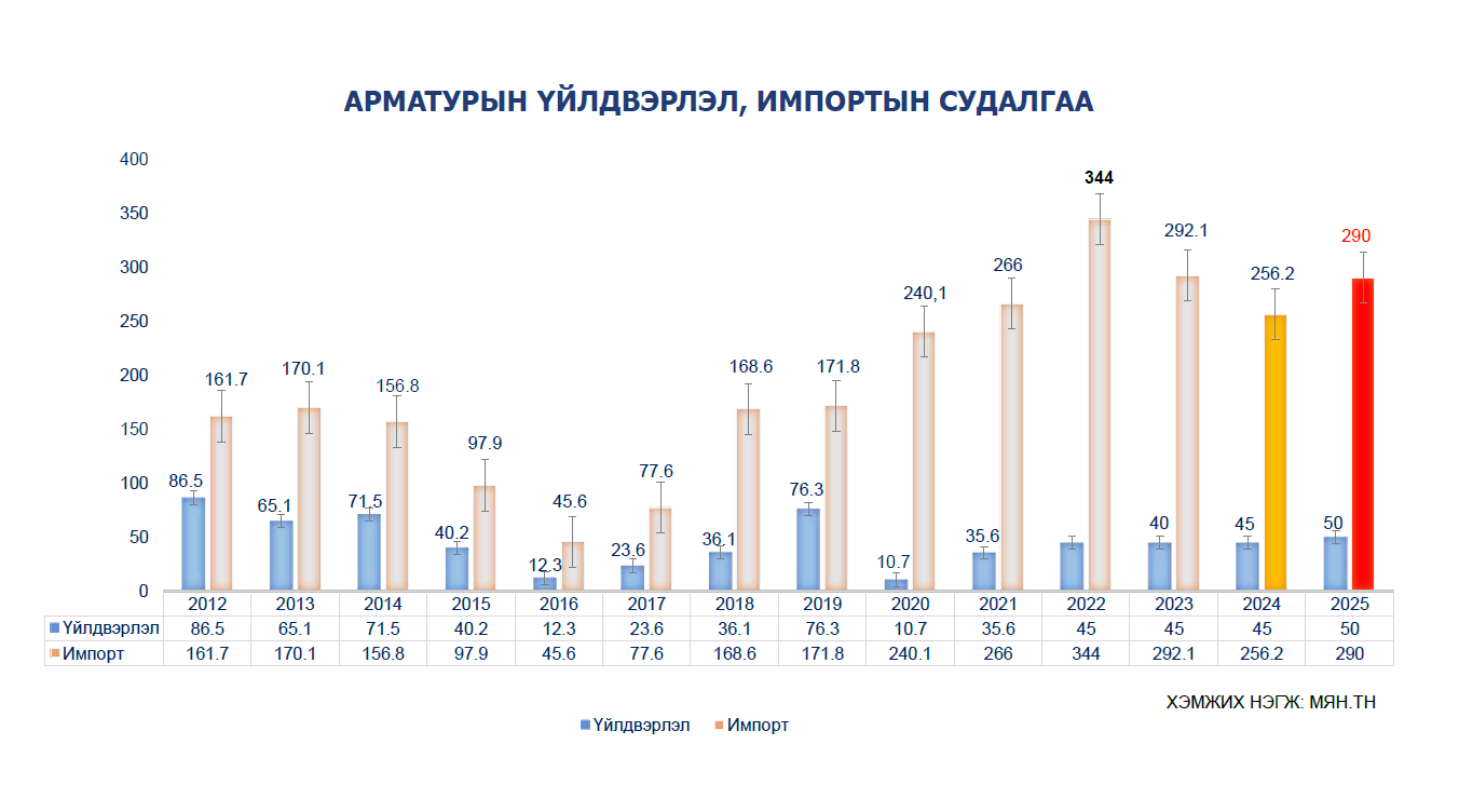 Барилгын төрлөөс хамааран төсөвт өртгийн 10–30 хувь хүртэлх хувийг эзэлдэг арматурын нийлүүлэлт нь 2025 оны 03 сарын байдлаар өмнөх оны мөн үетэй харьцуулахад 60% өсөлттэй байна. Гэвч жилийн эцсийн дүнгээс авч үзвэл арматурын эрэлт өмнөх жилүүдээс төдийлөн нэмэгдэхгүй байх төлөвтэй байгаа юм.