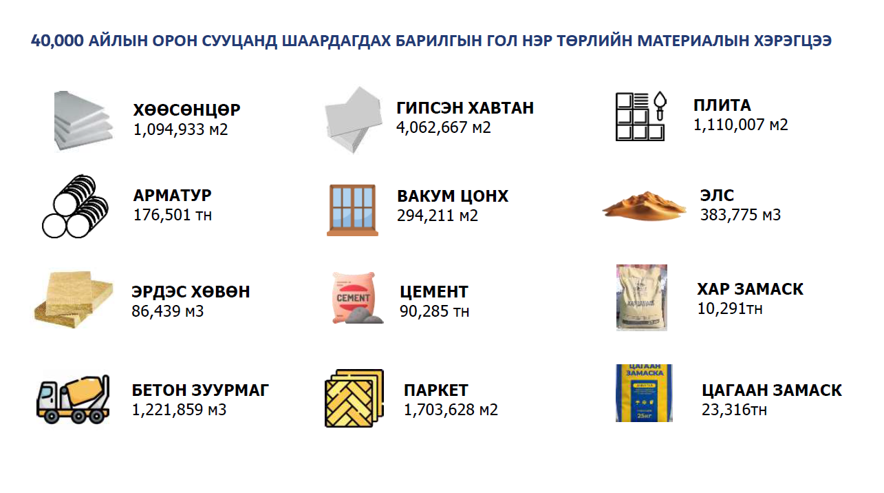 40 000 айлын орон сууцад 90 285 тн цемент, 176 501 тн арматур хэрэгцээтэй