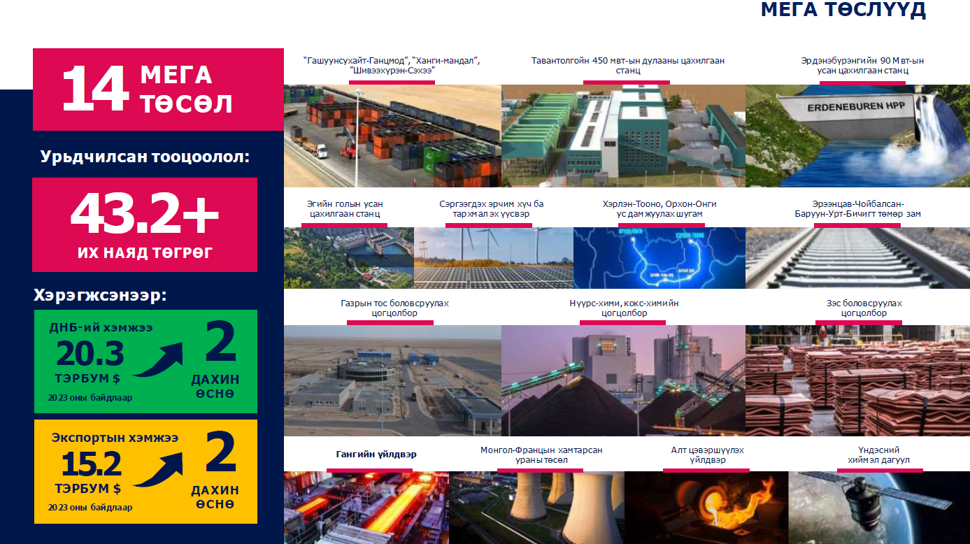 Засгийн газар 2025 оноос хэрэгжүүлж эхэлж буй 14 мега төсөл нь дэд бүтэц, эрчим хүч, уул уурхай зэрэг салбарыг хамарч, эдийн засгийн бүтээмжийг нэмэгдүүлэх, ажлын байр бий болгох, бүс нутгийн хөгжлийг дэмжих зорилготой. Эдгээр төслүүдийг хэрэгжүүлэхэд урьдчилсан тооцооллоор 43,2 их наяд төгрөгийн хөрөнгө оруулалт шаардлагатай байгаа юм.
