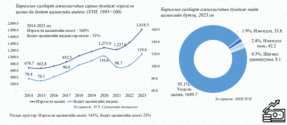 Барилгын салбар ажиллах хүчний хомсдолд өртөж буй бас нэг шалтгаан нь цалин хөлсний хангалтгүй байдал юм. 2014-2023 оны байдлаар нэрлэсэн цалингийн өсөлт 168% болж өссөн ч бодит цалингийн өсөлт ердөө 51% байна. Нэрлэсэн цалин өндөр байгаа ч бодит цалин хангалттай өсөхгүй байгаа нь нэрлэсэн цалин өсөхийн хэрээр татвар, шимтгэл нэмэгдэж байгаагаас шалтгаалж байна. Барилгын салбарт ажиллагчдын дундаж нийт цалингийн бүтцийн 95 хувь нь үндсэн цалин ба 1.9 хувь нь урамшуулал, 2.4 хувь нь илүү цаг, 0.5 хувь нь шагнал урамшуулал байна.