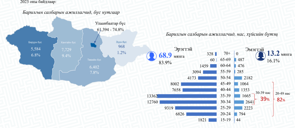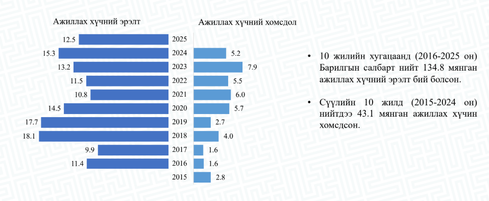 Манай улсад хөдөлмөрийн насны хүн ам гэдгийг 15 ба түүнээс дээш насны иргэдийг хэлдэг. Тэгвэл улсын хэмжээнд нийт хүн амын 62 хувь буюу 1.5 сая иргэн хөдөлмөрийн насны иргэд байна. Харин үлдсэн 38 хувь буюу 893 мянга нь ажиллах хүчнээс гадуурх хүн ам байгаа юм. Нийт 1.5 сая ажиллах хүчний 95 хувь буюу 1.3 сая нь ажиллагч бол 5.3 хувийг ажилгүй иргэн бүрдүүлж байна. Ажиллагчдыг эдийн засгийн үндсэн салбараар авч үзвэл, 2025 оны нэгдүгээр улирлын байдлаар нийт ажиллагчдын 49.5 (683.3 мянга) хувь нь үйлчилгээний салбарт, 27.5 (379.4 мянга) хувь нь хөдөө аж ахуйн салбарт, 23.0 (317.4 мянга) хувь нь аж үйлдвэр, барилгын салбарт ажиллаж байна.