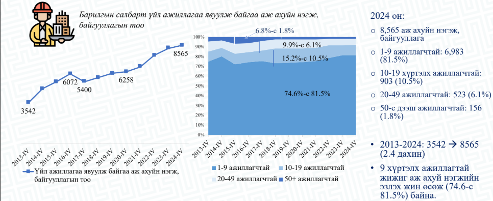 2024 оны дөрөвдүгээр улирлын байдлаар барилгын салбарт 8565 аж ахуй нэгж байгууллага үйл ажиллагаа явуулж байна. Барилгын салбарт үйл ажиллагаа эрхлэгч нийт байгууллагуудын 81.5 хувь буюу 6983 нь 1-9 ажиллагчтай, 10.5 хувь буюу 903 нь 10-19 ажиллагчтай, 6.1 хувь буюу 523 байгууллага 20-49 ажиллагчтай бол 1.8 хувь буюу 156 байгууллага 50-аас дээш тооны ажиллагчтай байна. 2013 ба 2024 оны мөн үетэй харьцуулахад барилгын салбарт үйл ажиллагаа эрхлэгч аж ахуй нэгжийн тоо 2.4 дахин өссөн ба 9 хүртэлх ажиллагчтай жижиг аж ахуй нэгжийн эзлэх жин 81.5 хувь болж нэмэгджээ.