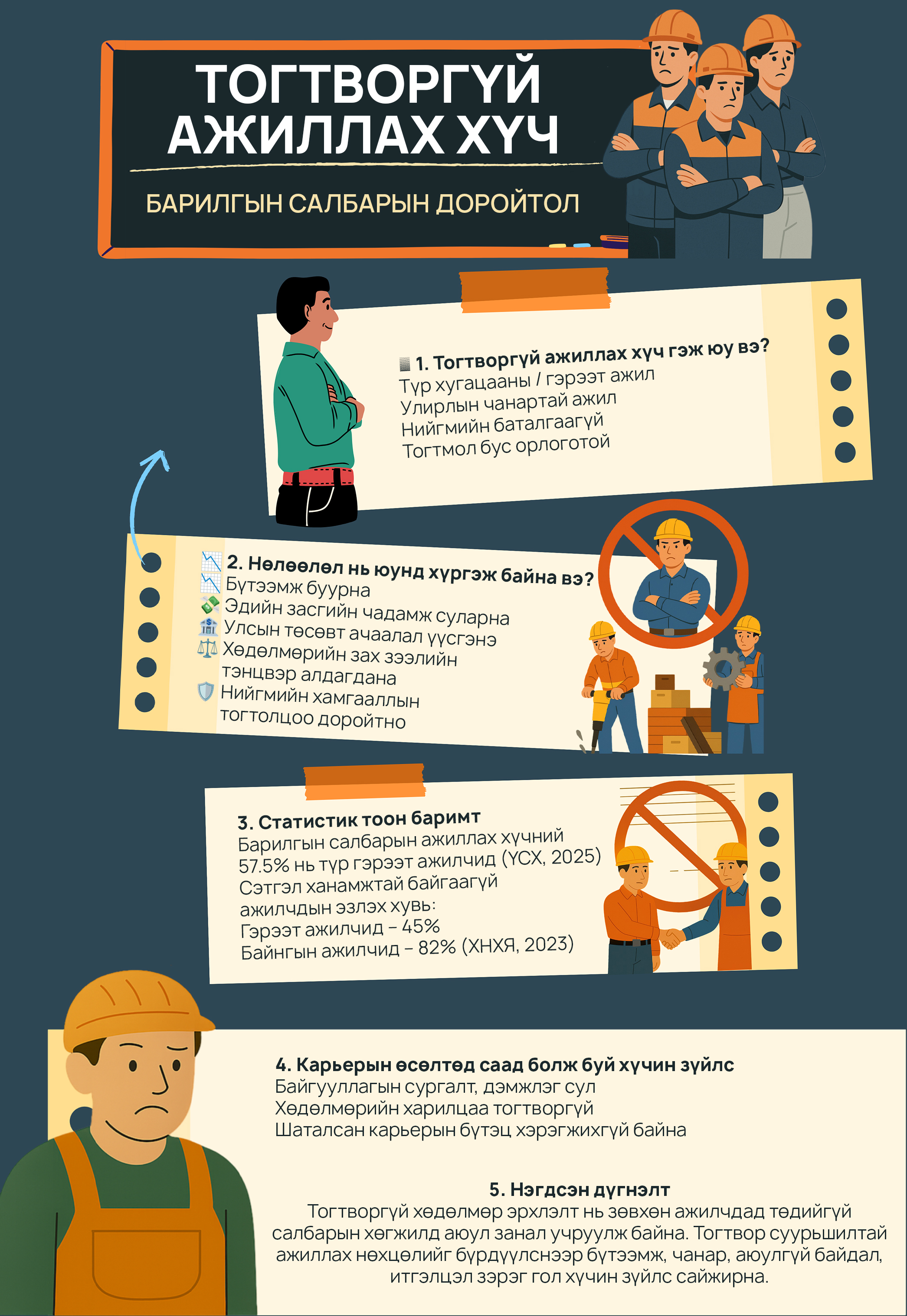 Барилгын салбар нь Монгол Улсын эдийн засгийн гол тулгуурын нэг бөгөөд дэд бүтэц, орон сууц, нийтийн барилга байгууламжийн бүтээн байгуулалтаар хөгжлийг дэмждэг. Гэвч энэ салбарт түр зуурын, улирлын шинжтэй, богино хугацааны гэрээт ажлын байр давамгайлж байгаа нь ажилчдын тогтвортой хөдөлмөр эрхлэлт, урт хугацааны карьер төлөвлөлтөд сөргөөр нөлөөлж байна гэж үзэж байна.