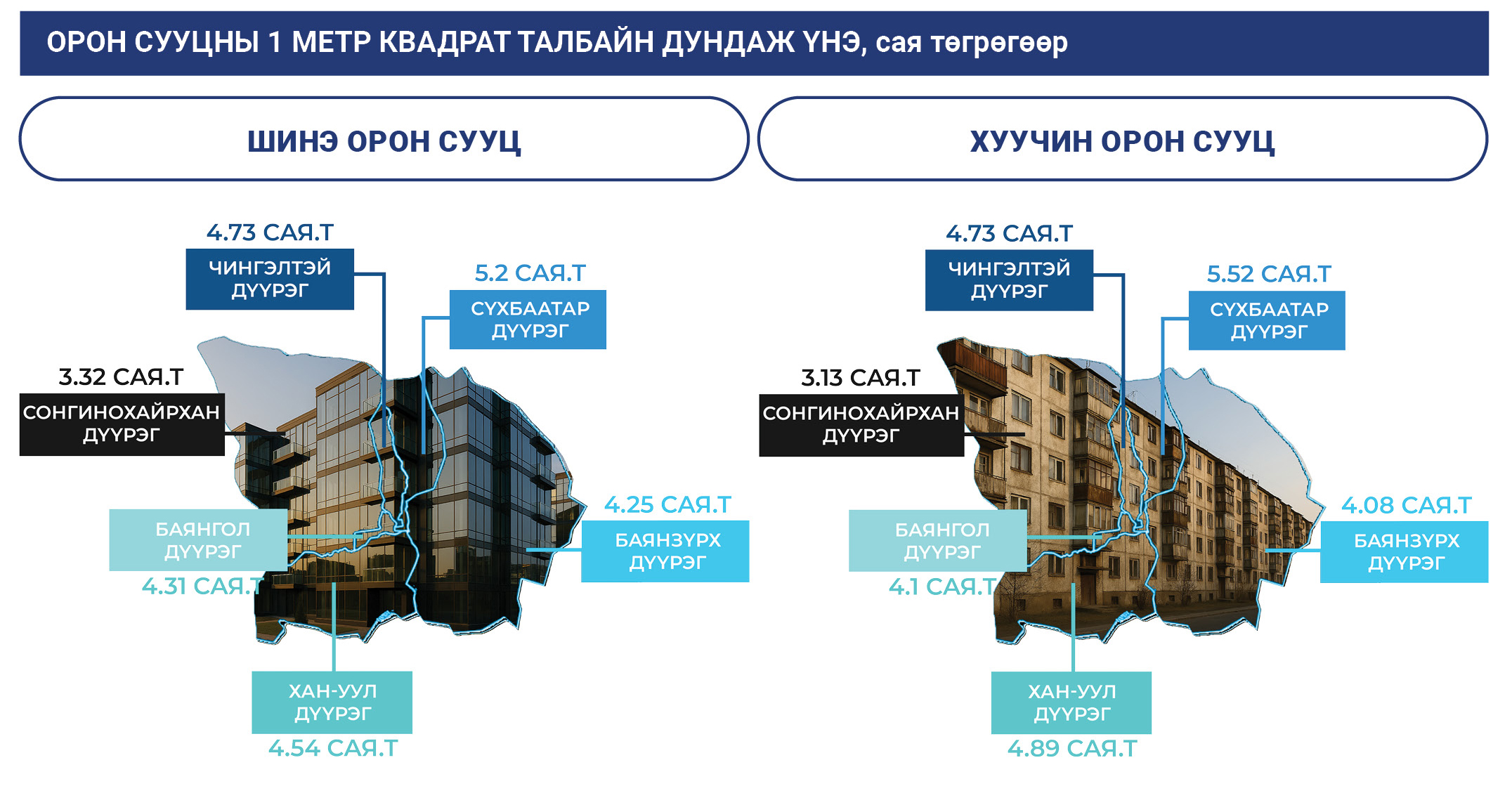 2025 оны 5 дугаар сард шинэ орон сууцны 1 метр квадрат талбайн дундаж үнэ 4.55 сая төгрөг болж, Сүхбаатар дүүрэгт хамгийн өндөр буюу 5.49 сая төгрөгийн үнэтэй байна. Шинэ орон сууцны дундаж үнэ өмнөх оны мөн үетэй харьцуулахад Сүхбаатар дүүрэгт 37.3 хувь (1488.9 мянган төгрөг)-аар өссөн нь хамгийн өндөр, Баянгол дүүрэгт 3.0 хувь (124.9 мянган төгрөг)-аар өссөн нь хамгийн бага байна.
