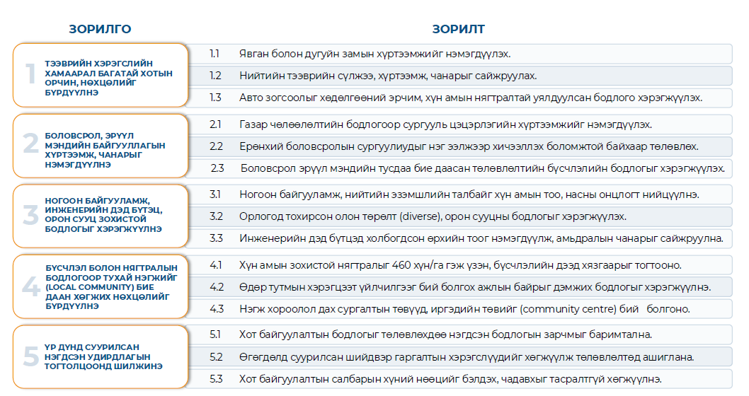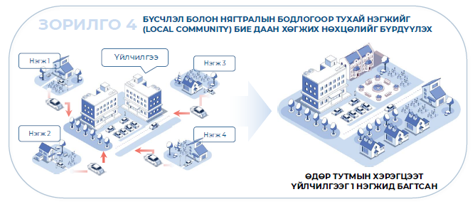 2030 он хүртэл нийтийн үйлчилгээ, дэлгүүр, ногоон байгууламж, боловсролын байгууллагуудын хүртээмжийг нэмэгдүүлж, иргэдэд ойртуулах төлөвлөгөө хэрэгжүүлсэн.