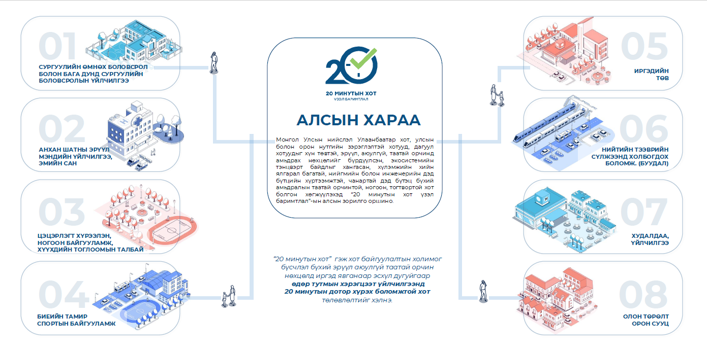 УИХ - ын гишүүн, "20 минутын хот" төслийн ажлын хэсгийг ахлагч Г.Лувсанжамц: Хот төлөвлөлтийн үндсэн философи нь ирээдүй хойч үеийн боловсролын хүртээмж ба амьдралын чанар юм. Улаанбаатар хотын хаана сургууль, цэцэрлэг, эмнэлэг, тоглоомын талбай, ногоон байгууламжгүй байна вэ гэдгийг гаргаж ирэхийн тулд Egazar, Ebarilga, дэд бүтцийн порталууд зэрэг тус тусдаа байгаа мэдээллийг нэг платформд төлөвлөрүүлэн, бодит дата дээр тулгуурлан “20 минутын хот” - ыг төлөвлөнө.