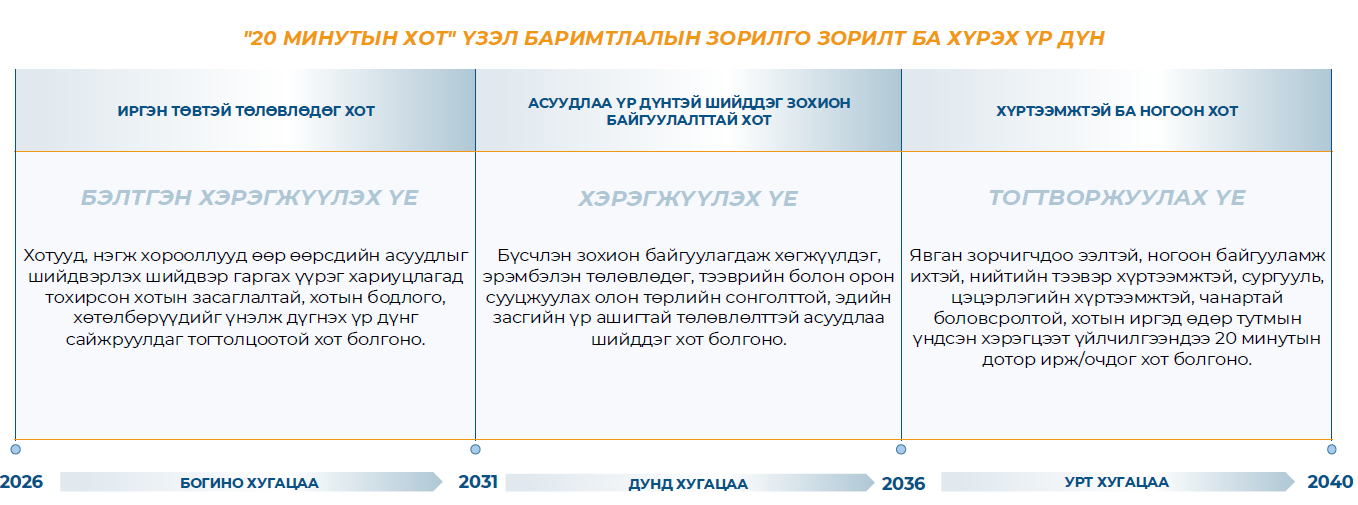Улаанбаатар хотын 2040 он хүртэлх хөгжлийн ерөнхий төлөвлөгөө нь “Амьдрахад таатай, байгаль орчинд ээлтэй, ухаалаг, цогц, цомхон хот болгон хөгжүүлнэ” гэж зорилгоо тодорхойлсон. Харин энэхүү зорилгод хүрэх зорилтын томоохон хэсэг нь “20 минутын хот” концепц юм.