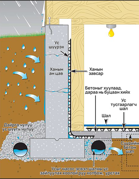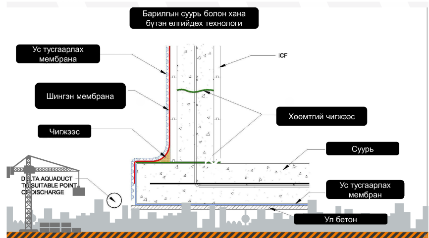 Барилгын суурь болон ханыг бүтэн өлгийдөж хөрстэй харьцаж байгаа бүх хэсэгт ус тусгаарлах ажил бүрэн хийгдэнэ.