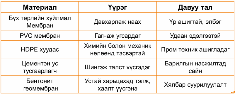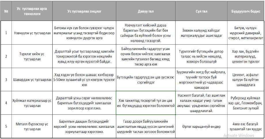 Хүснэгт 1. Ус тусгаарлах арга технологиуд ба түүний давуу, сул тал