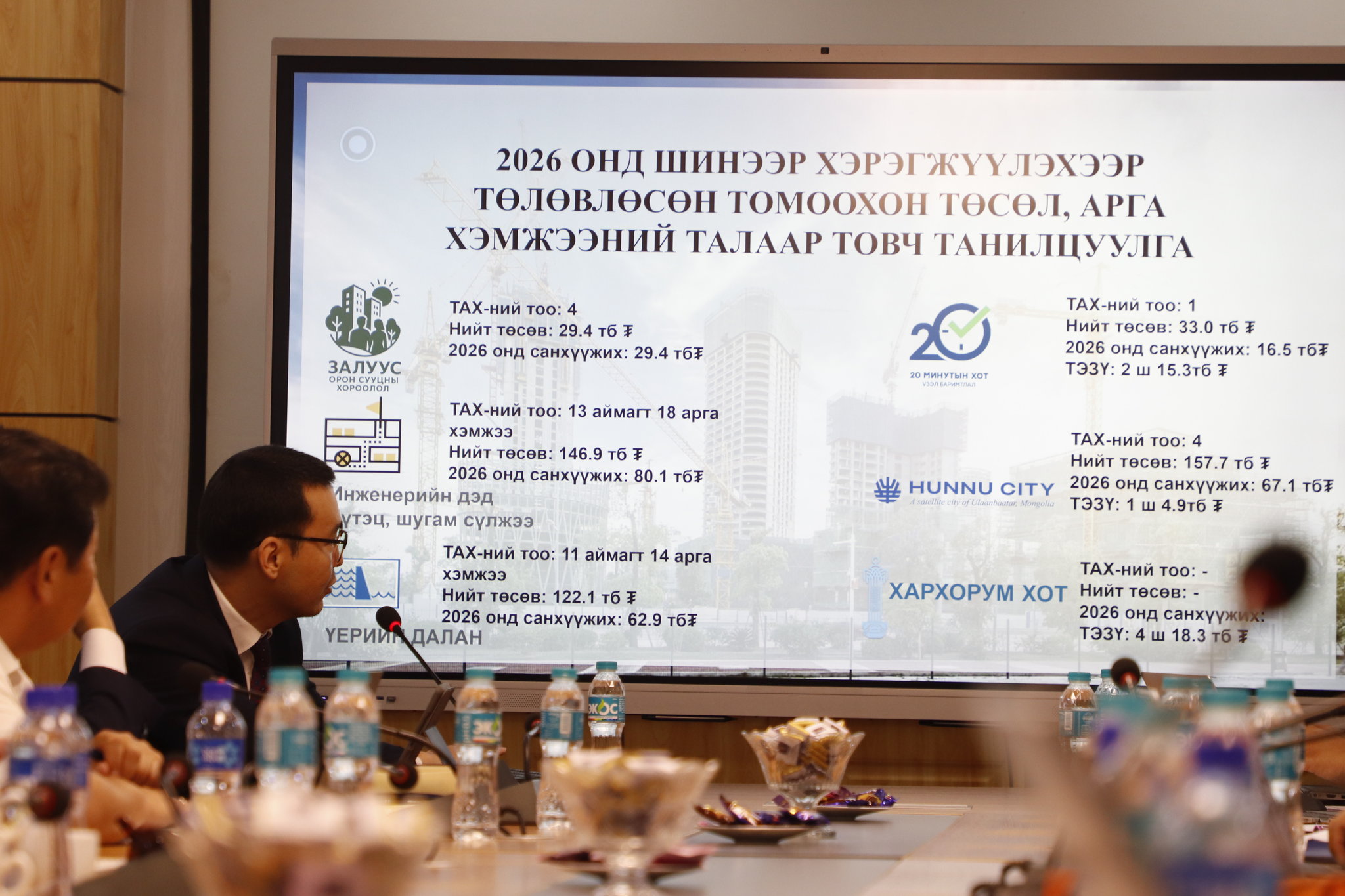 Тус яамны Хот байгуулалт, орон сууцжуулалтын бодлого зохицуулалтын газрын хэлтсийн дарга Э.Батболд 2026 онд хэрэгжүүлэхээр төлөвлөж буй томоохон төсөл хөтөлбөрүүд, 2026 онд шаардлагатай улсын төсвийн санхүүжилтийн талаар танилцууллаа.