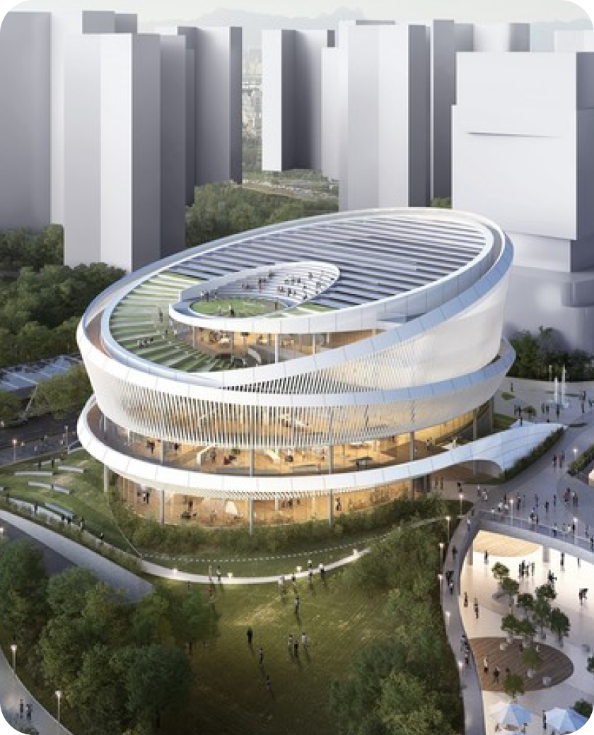 Шатны оронд спираль хэлбэрийн тасралтгүй налуу замаар дээш гардаг бүтэцтэй бөгөөд түүний дагуу бүх номын тавиурууд байрладаг. Дээвэр дээр “Sky Library” хэмээх уншлагын орон зай, мөн номын кафе, тоглоомын хэлбэрийн уншлагын хэсэг, хиймэл оюунаар зурагт ном бүтээх өрөө зэрэг шинэлэг байгууламжуудтай.