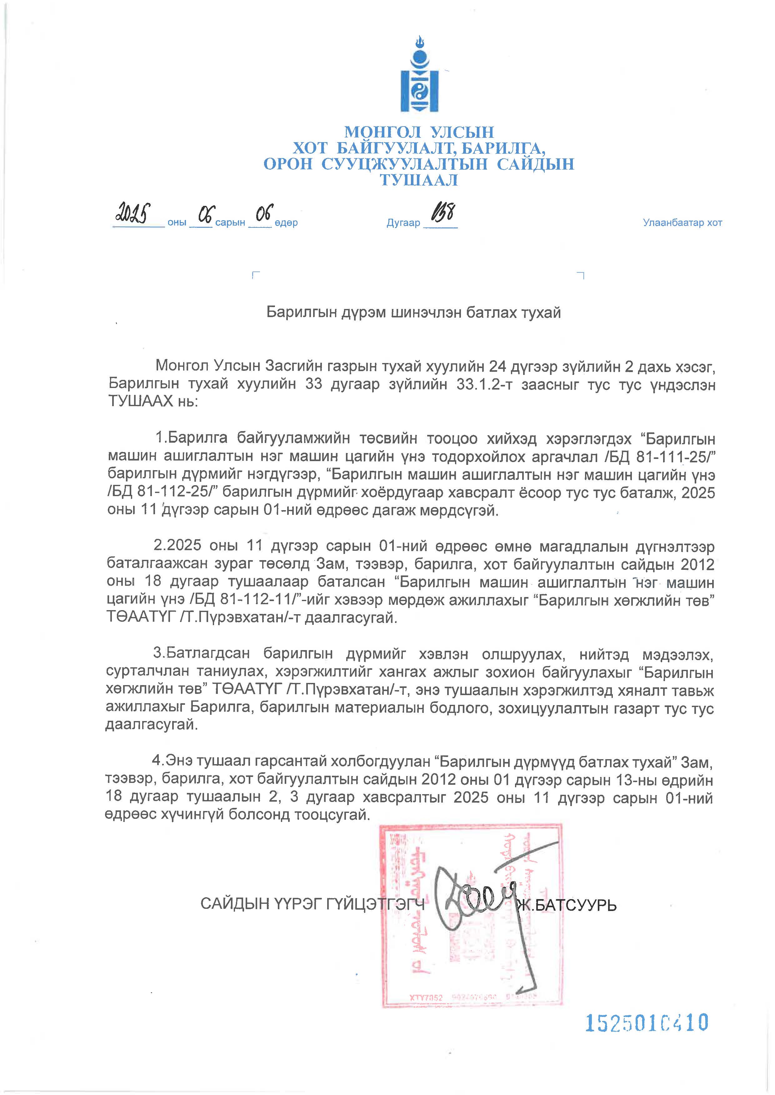 Тодруулбал, Хот Байгуулалт, Барилга, Орон сууцжуулалтын сайдын 2025 оны 06 дугаар сарын 06-ны өдрийн 138 дугаар тушаалаар: