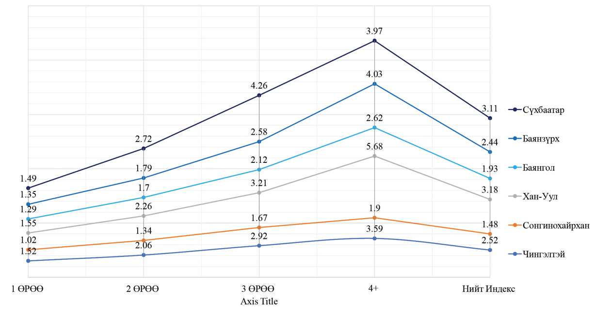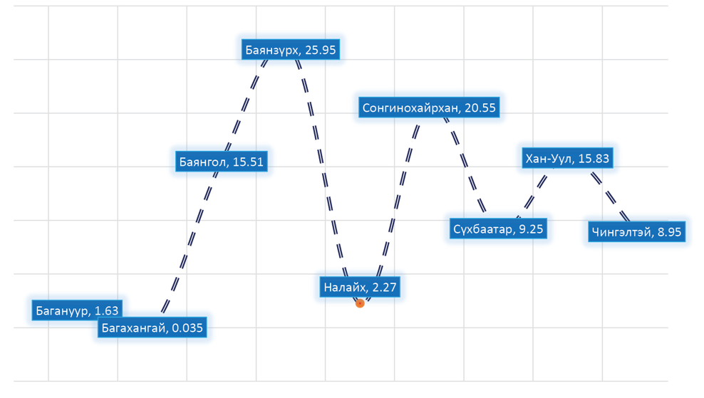 Дээрх график нь өрөөний зөрүү дээр үнийн ялгаа ямар хэмжээнд гарж байгааг илэрхийлж байгаа бөгөөд Чингэлтэй дүүргийн хувьд ганцхан өрөөний зөрүүтэй байхад хамгийн их зөрүүтэй үнэ ханштай байсан ба 2.75 сая төгрөгний зөрүүтэй байна. Харин хамгийн бага зөрүүтэй дүүргийн хувьд Сонгинохайрхан дүүрэг байсан ба ердөө 620’000 төгрөгний зөрүүтэй байна.