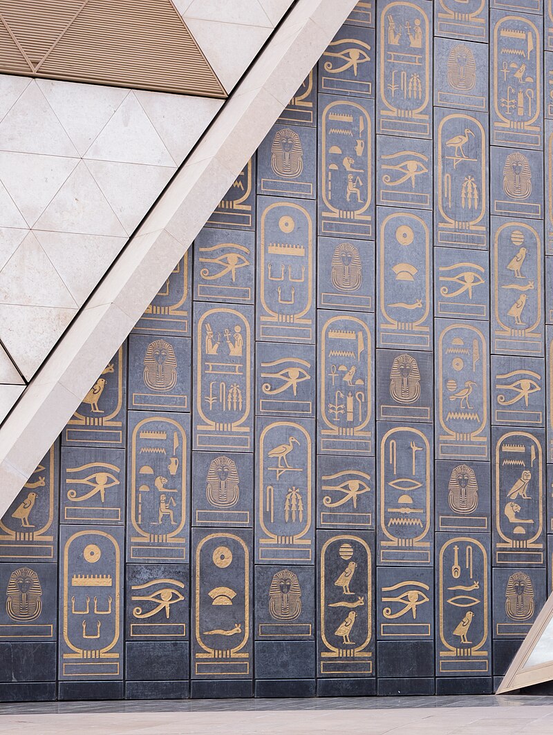 GEM-ийн хамгийн онцлох хэсэг бол Гизагийн алдарт пирамидтай уялдуулан төлөвлөсөн пирамид хэлбэрийн шилэн фасад юм.Архитекторууд шил, чулуу, бетон элементүүдийг уран нарийн хослуулснаар нарны гэрлийг дотоод орчинд жигд нэвтрүүлж, байгалийн гэрэлтүүлэг болон эрчим хүчний хэмнэлтийн төгс тэнцвэрийг бий болгожээ.
