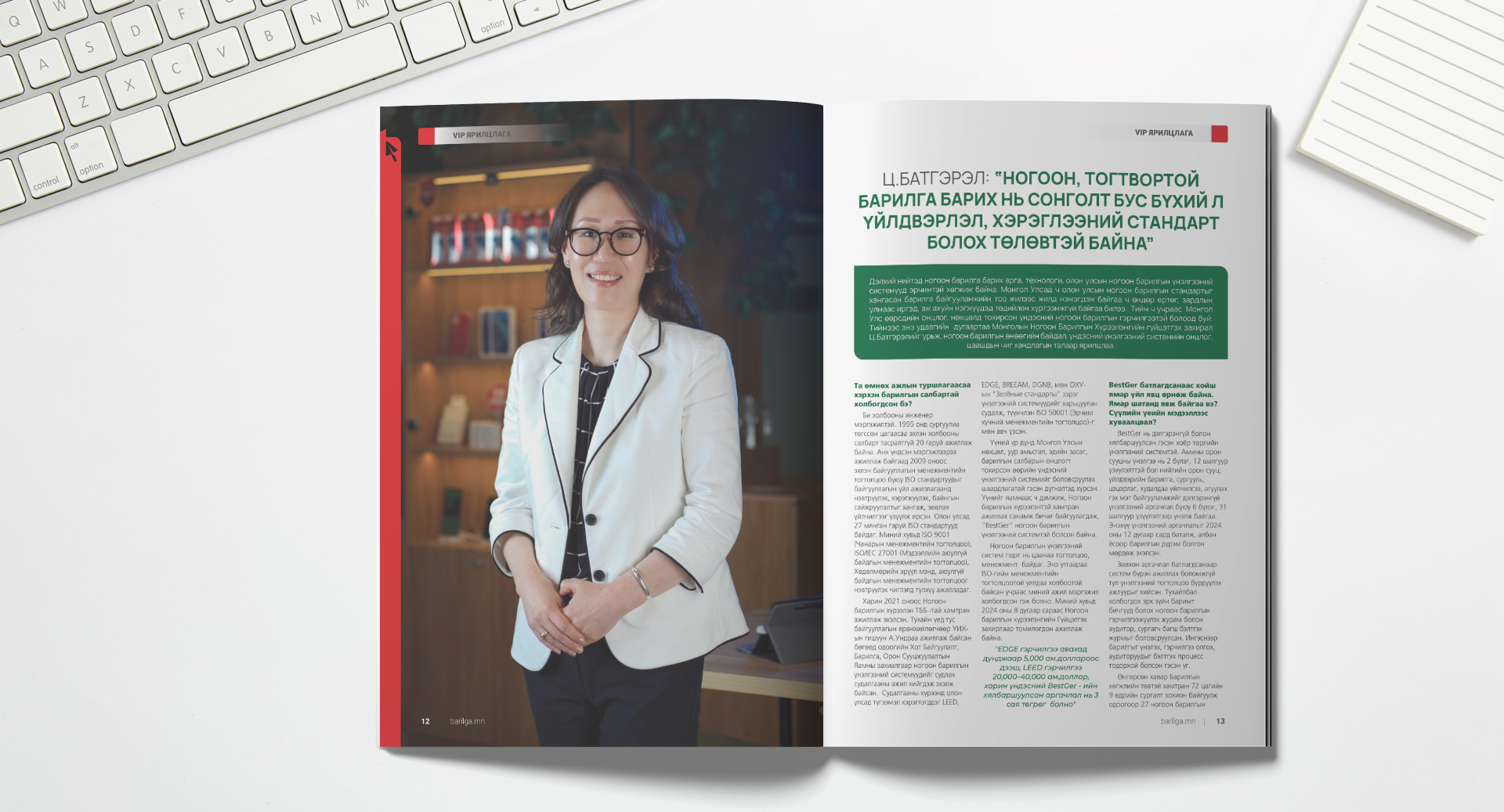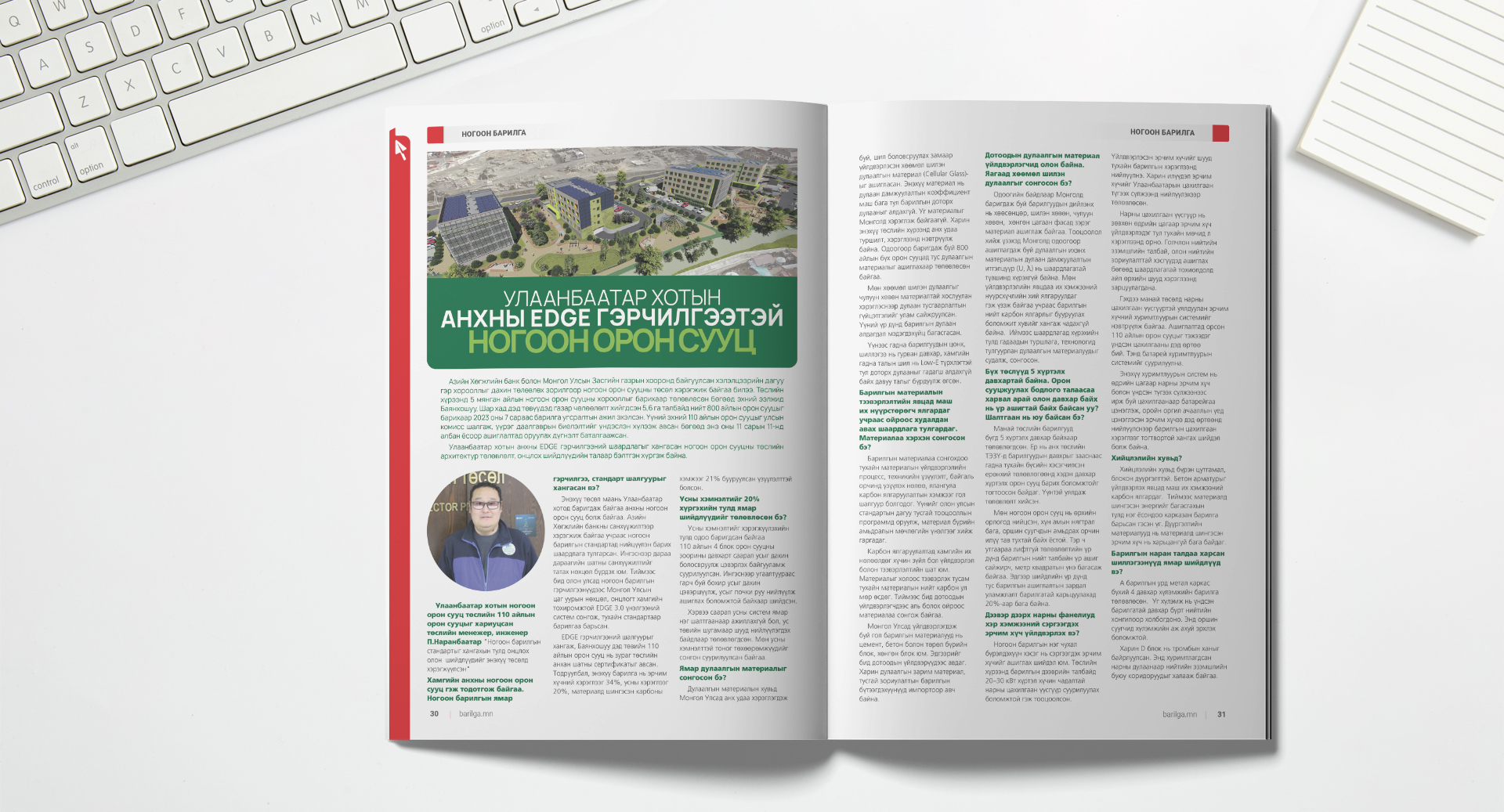 Дэлхий нийтэд ногоон барилга барих арга, технологи, олон улсын ногоон барилгын үнэлгээний системүүд эрчимтэй хөгжиж байна. Монгол Улсад ч олон улсын ногоон барилгын стандартыг хангасан барилга байгууламжийн тоо жилээс жилд нэмэгдэж байгаа ч өндөр өртөг, зардлын улмаас иргэд, аж ахуйн нэгжүүдэд төдийлөн хүртээмжгүй байгаа билээ. Тийм ч учраас Монгол Улс өөрсдийн онцлог, нөхцөлд тохирсон үндэсний ногоон барилгын үнэлгээний системтэй болоод буй. Тиймээс энэ удаагийн дугаартаа Монголын Ногоон Барилгын Хүрээлэнгийн гүйцэтгэх захирал Ц.Батгэрэлийг урьж, ногоон барилгын өнөөгийн байдал, үндэсний үнэлгээний системийн онцлог, цаашдын чиг хандлагын талаар ярилцлаа.