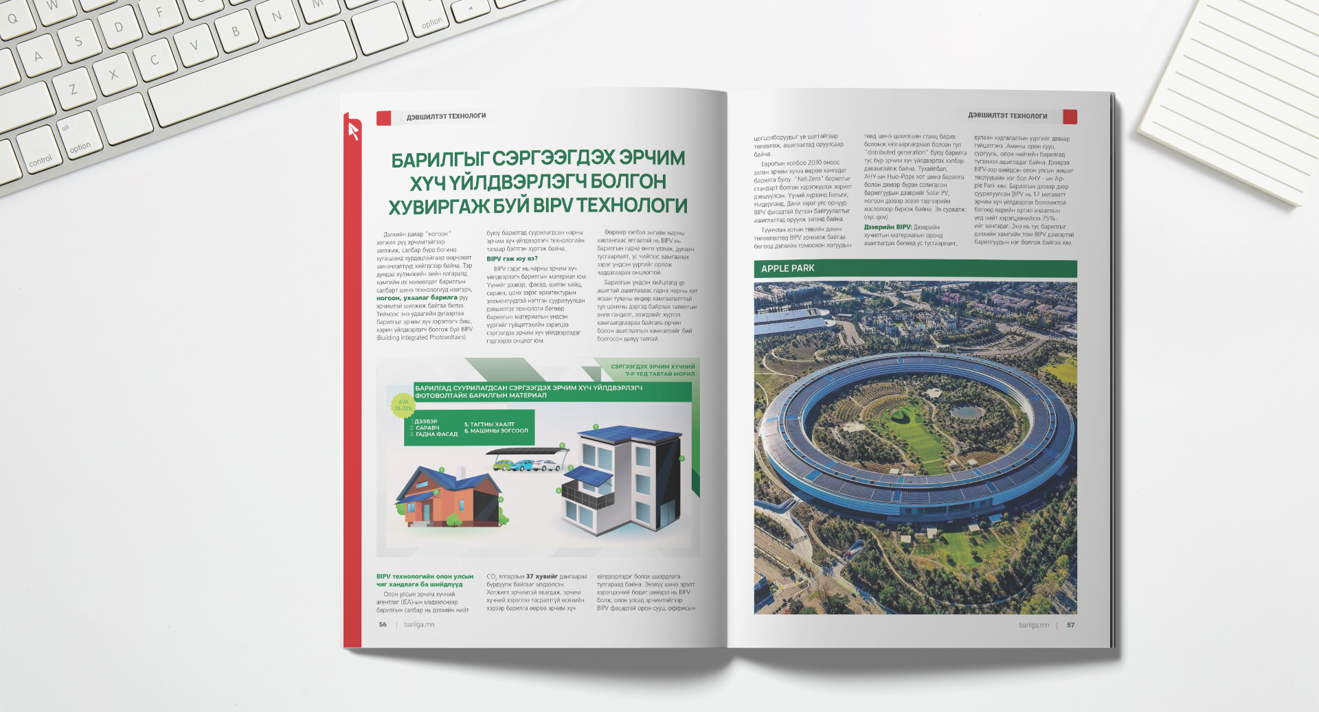 Дэлхийн даяар “ногоон” хөгжил рүү эрчимтэйгээр шилжиж, салбар бүрд богино хугацаанд хурдацтайгаар өөрчлөлт шинэчлэлтүүд хийгдсээр байна. Тэр дундаа хүлэмжийн хийн ялгаралд хамгийн их нөлөөлдөг барилгын салбарт шинэ технологиуд нэвтэрч, ногоон, ухаалаг барилга руу эрчимтэй шилжиж байгаа билээ. Тиймээс энэ удаагийн дугаартаа барилгыг эрчим хүч хэрэглэгч биш, харин үйлдвэрлэгч болгож буй BIPV (Building Integrated Photovoltaics) буюу барилгад суурилагдсан нарны эрчим хүч үйлдвэрлэгч технологийн талаар бэлтгэн хүргэж байна.