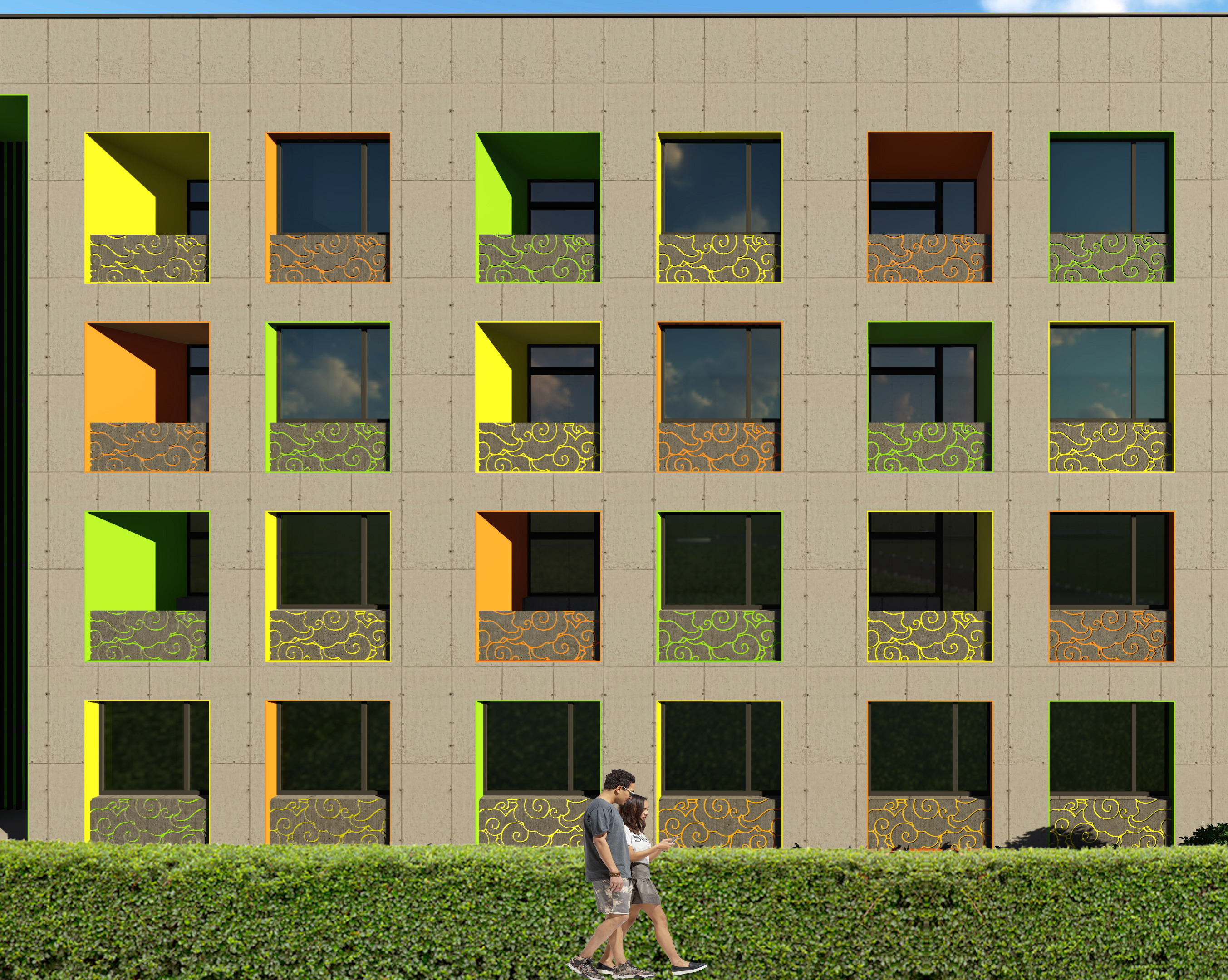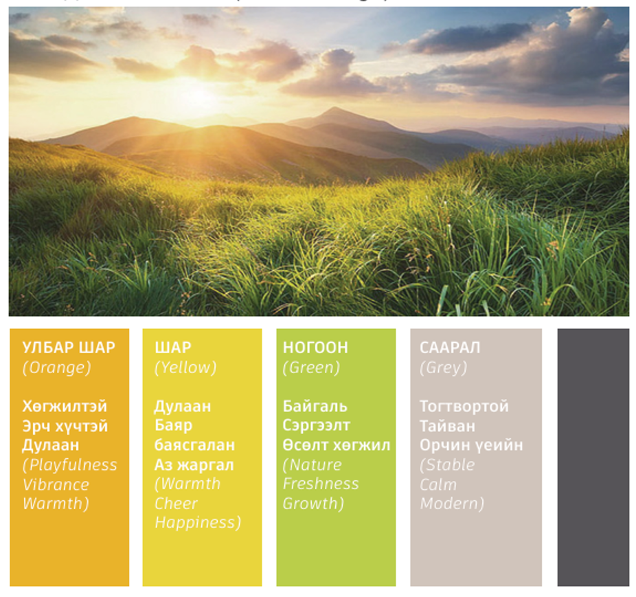 Нугад өглөөний нар мандаж буй байгалийн үзэгдлээс суурь өнгөнүүд болох саарал, ногоон, шар, улбар шар, хар саарал өнгөнүүдийг тодорхойлж “Ногоон орон сууц” төслийн гадна фасадны өнгө төрхийг бүрдүүлсэн. Мөн хурмаст тэнгэрийн хурын шимээр байгаль дэлхий сэргэж, хүн бүр аз жаргалтай аж төрөхийг бэлгэдсэн зол жаргалын хээтэй бөгөөд хязгааргүй эрх чөлөө, баялаг, эцэс төгсгөлгүйг бэлгэднэ.