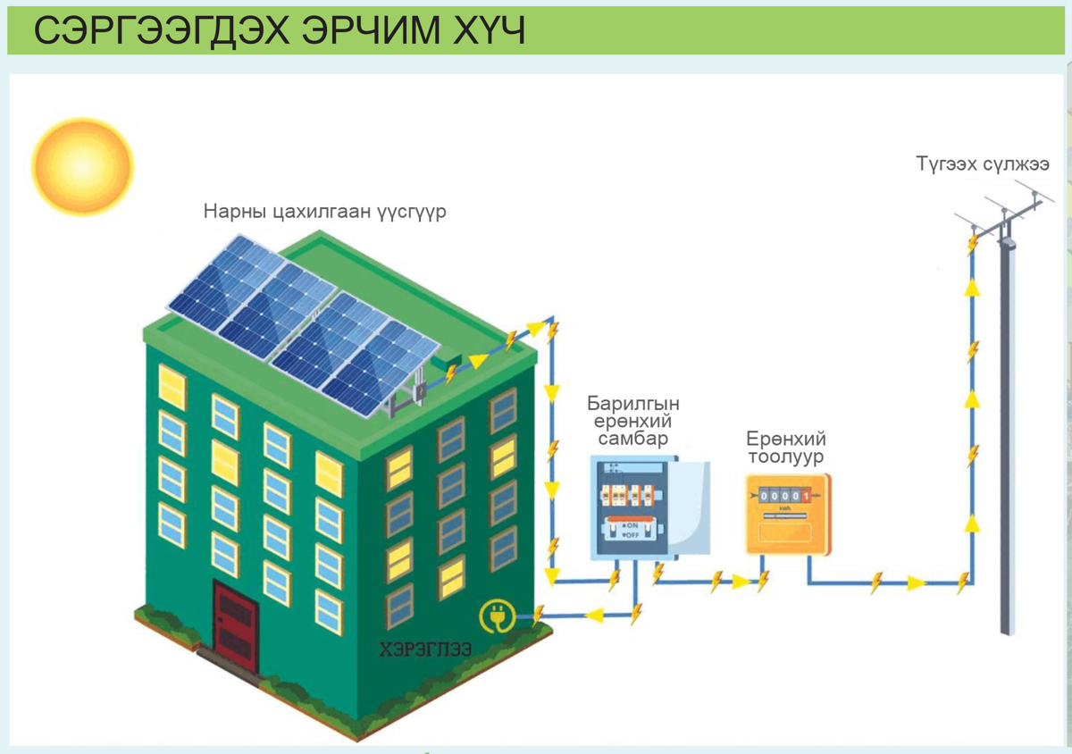 Гэхдээ манай төсөлд нарны цахилгаан үүсгүүртэй уялдуулан эрчим хүчний хуримтлуурын системийг нэвтрүүлж байгаа. Ашиглалтад орсон 110 айлын орон сууцыг тэжээдэг үндсэн цахилгааны дэд өртөө бий. Тэнд батарей хуримтлуурын системийг суурилуулна.