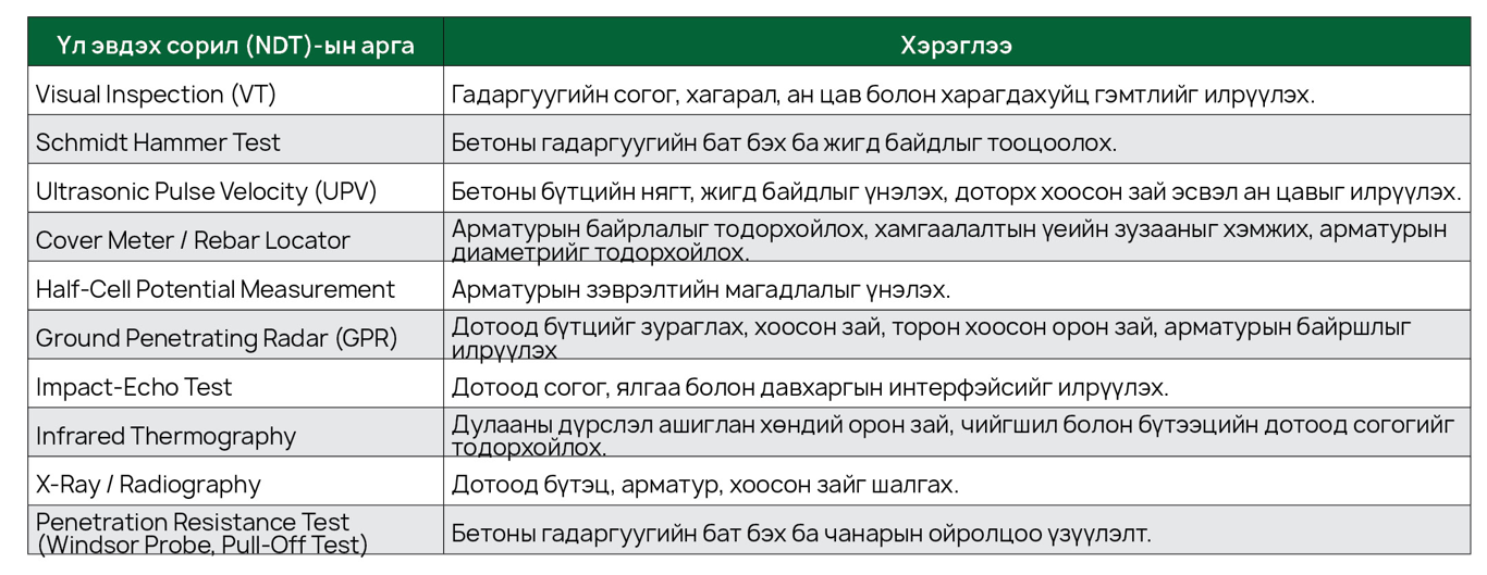 Иймд биет үзлэг (VT), бетоны гадаргуугийн бат бэхийг ойролцоогоор үнэлэх Шмидтийн алхны сорил (Schmidt Hammer), хэт авианы тархалтын сорилын арга (UPV), арматур илрүүлэх зэрэг нийтлэг үл эвдэх аргачлалуудыг уялдуулан хэрэглэснээр бетоны бат бэх, бүтцийн жигд байдал, дотоод согог, арматурын байршил, хамгаалалтын үеийн зузаан зэрэг чухал үзүүлэлтүүдийг иж бүрэн үнэлэх боломж бүрдэнэ.