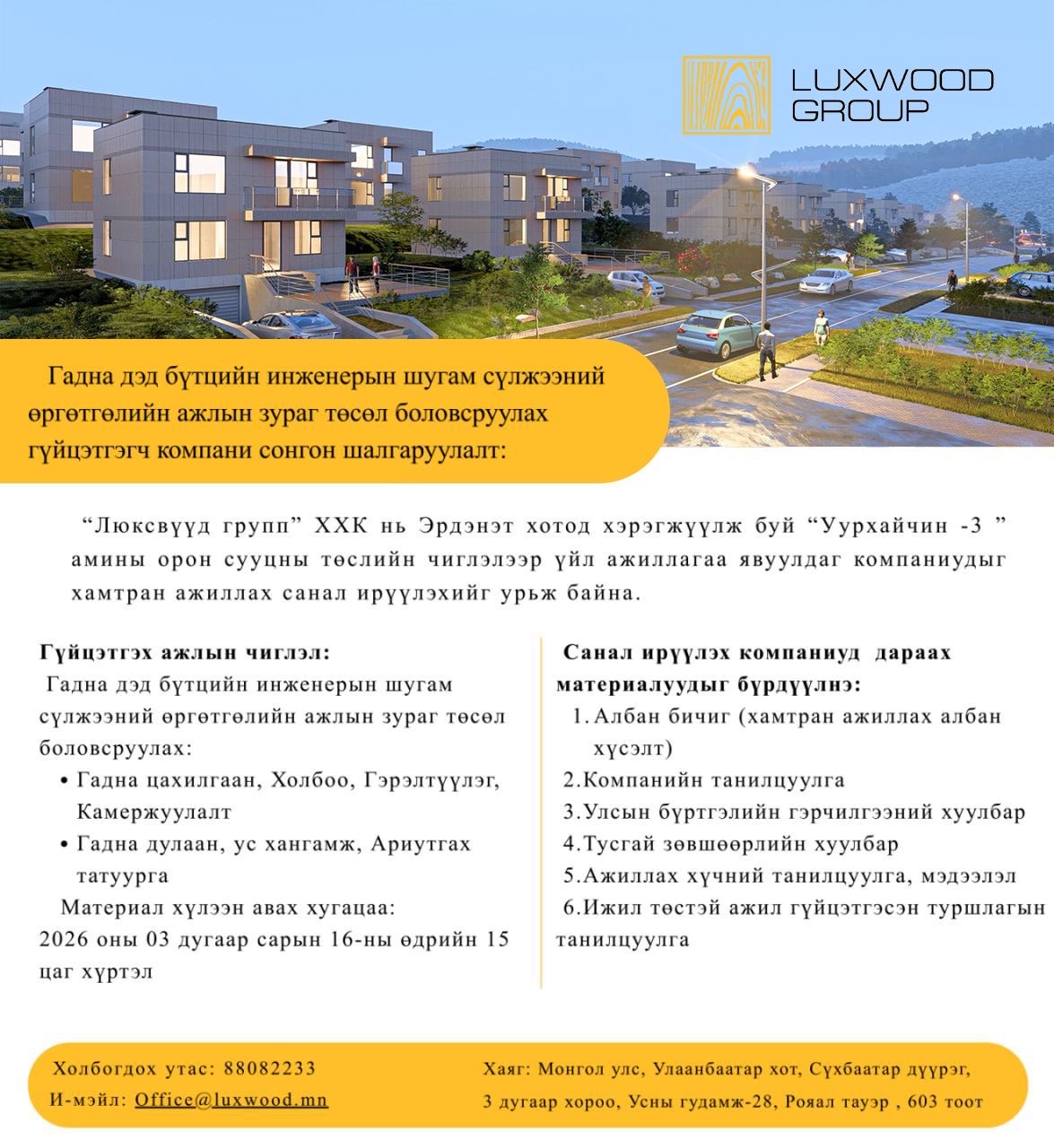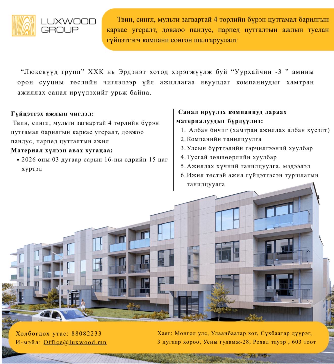 Люксвүүд групп” ХХК нь Эрдэнэт хотод байрлах “Уурхайчин-3” амины орон сууцны төслийг "ЭРДЭНЭТ ҮЙЛДВЭР" ТӨҮГ-ийн захиалгаар хэрэгжүүлж байгаа бөгөөд төслийн хүрээнд хамтран ажиллах, гүйцэтгэх чиглэлээр үйл ажиллагаа явуулдаг компаниудыг санал ирүүлэхийг урьж байна.