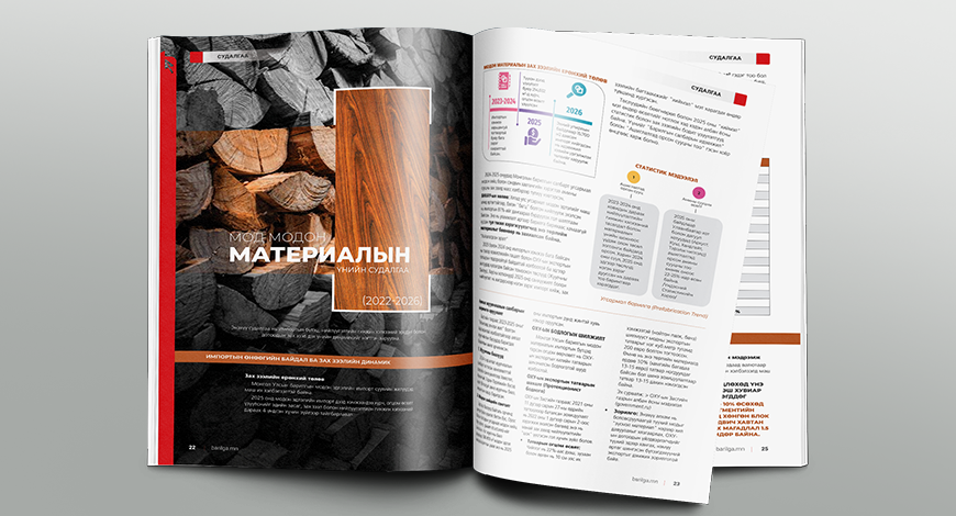 Та Судалгаа булангаас Мод модон материалын 2022-2026 оны хооронд дахь импорт, нийлүүлэлт, үнэ ханшийн талаарх хүлээн авч унших боломжтой.