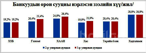 Одоогийн байдлаар хамгийн бага хүү ХХБ-ны орон сууцны зээлийн хүү жилийн 19,2% байна. Хамгийн их нь 28,8% буюу Хадгаламж банкны зээлийн хүү байна. Орон сууцны зээлийн хүү жилийн 19,2% байна гэдэг нь маш өндөр юм. Тиймээс иргэд зээл авах сонирхолгүй болох ба улмаар орон сууцны эрэлтийг тодорхой хэмжээгээр бууруулж болох юм.