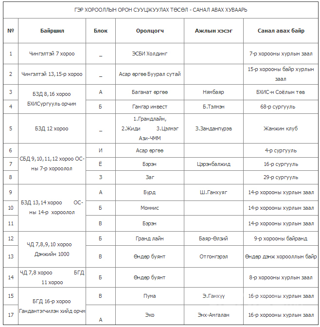 Улаанбаатар хотод нийт 20951 мянган өрхийн 135 төсөл хэрэгжиж байна. Эдгээр төслүүдийн борлуулалт одоогийн байдлаар дунджаар 72%-тай явагдаж байна. Хамгийн их захиалга авах дүүрэг нь ХУД 36% нь захиалгаа аваагүй байна. Энэ нь ХУД-т тансаг зэрэглэлийн үнэтэй орон сууц болон хаус байгаатай холбоотой юм.