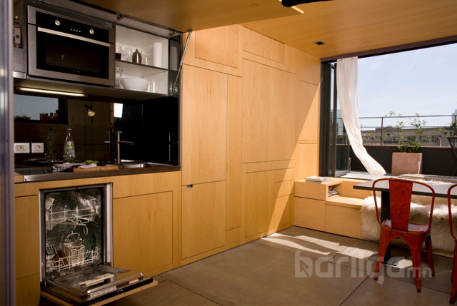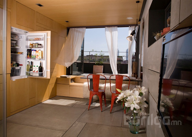 Байрны урагшаа харсан жижиг цонхтой ханыг тэр чигт нь цонх болгон томруулжээ. Цонхныхоо наана буйданг орлох модон суудал хийсэн бөгөөд түүн дотор хоёр хүний унтлагын хураагддаг ор багтдаг. Ор хураасан үед энэ хэсгийг зочны өрөөний зориулалтаар ашиглаж болно. Харин цонхны баруун талын ханыг саарал өнгөөр будсан бөгөөд хавтгай телевизор өлгөж, эвхэгддэг ажлын ширээ байрлуулжээ. Зүүн талын хана нь шаргал модон тавилгатай.