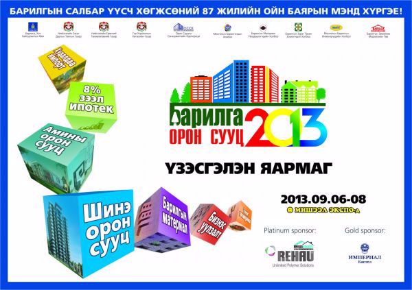 Монгол улсад барилгын салбар үүсч хөгжсөний түүхт 87 жилийн ойн баярыг тохиолдуулан “Барилга орон сууц-2013” үзэсгэлэн яармагийг 9-р сарын 6-8-ны өдрүүдэд Мишээл экспод зохион байгуулах гэж байна. Үзэсгэлэн яармагт УБ хотод баригдаж байгаа стандарт болон тансаг зэрэглэлийн 80 гаруй орон сууцнууд, Ипотекийн 8% зээл олгож байгаа арилжааны банкууд, барилгын материалын үйлдвэрлэгч, импортлогчид болон амины орон сууцны чиглэлээр үйл ажиллагаа явуулдаг 120 гаруй аж ахуйн нэгж, байгууллага оролцох юм.
