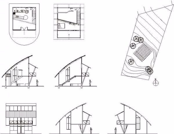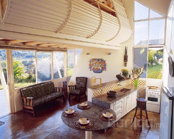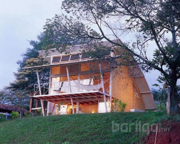 Дээврийн хэсэг дээрээсээ доош хүртэл налуу хийгдсэн учир байшингийн ар нь ханын үүргийг гүйцэтгэж байгаа юм. Мэдээж барилгыг маш сайн төлөвлөж барьсан бөгөөд нэгдүгээр давхартаа тохилог зочны өрөө, гал тогооны хэсэг байрлах бол хоёрдугаар давхарт унтлагын өрөө байрлана. Налуу тааз нь хүрээлэн буй ойн төгөлийн гоо үзэмжийг шингээсэн дотоод засалтайгаас гойд нийцжээ. Байшингийн гадна хэсгийг Африкийн урцыг санагдуулам хээгээр гоёсон бөгөөд хээ нь байшинг бүхэлд ороосон байдлаар урлан чимэглэжээ.