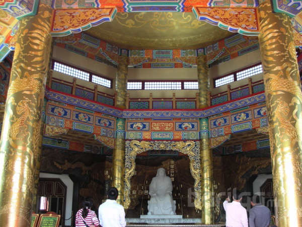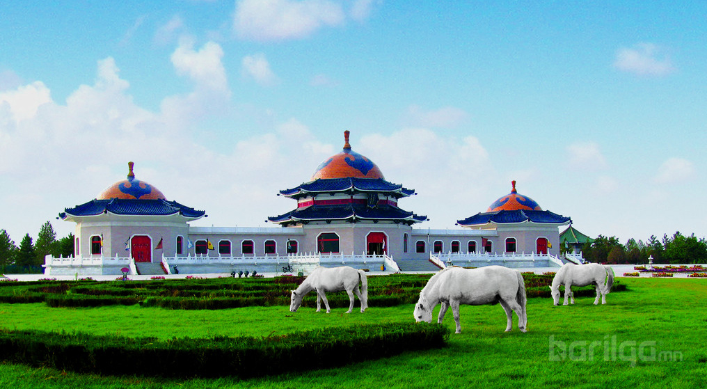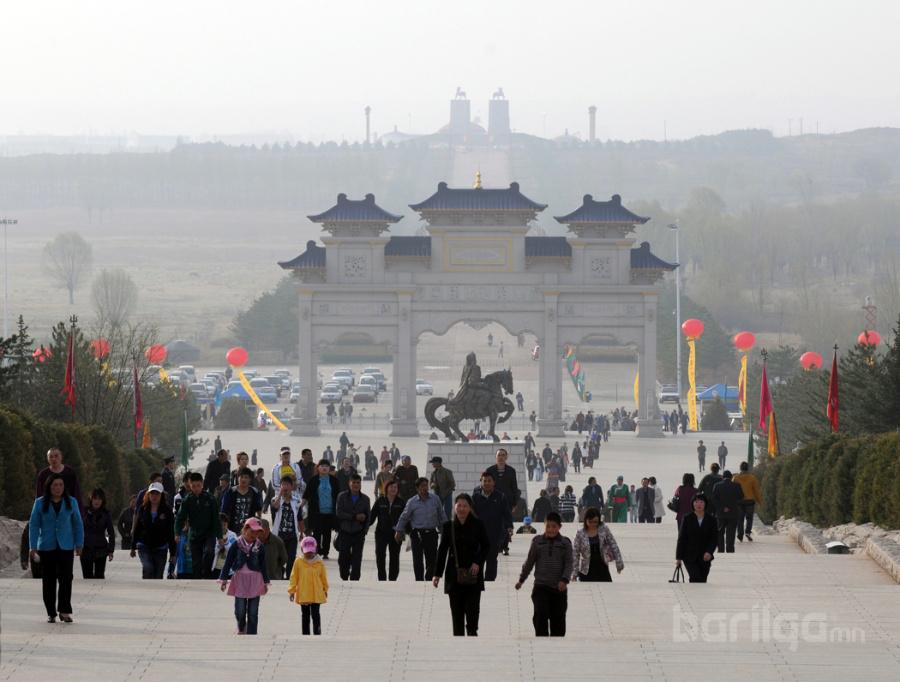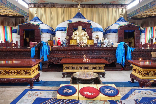 Чингисийн онгон 2 цогцолбор хэсэгтэй. Нэг нь Чингисийн онгон шүтээн байрладаг 3 залгаа гэр маягтай ордон. Нөгөө нь өнгөрсөн жилээс бүрэн ашиглалтад орсон "Чингис хааны цогцолбор музей". 3 залгаа гэр хэлбэртэй цагаан ордны өмнө омголон морь унасан Чингис хааны хүрэл хөшөө байна. 3 байшингийн дундах том гэрийн хэлбэртэй ордон нь Чингис хааны тахилгын танхим юм байна. Гэрээр бол хоймортоо их Хааны дүртэй 4,5 м орчим өндөр алтадсан хөшөө байрлуулж өмнө нь зул хүж, идээ цагаа, жимс, чихэр тэргүүтнийг өржээ. Алтадмал хөшөөний ар талаар тухайн цагийн цэрэг баатруудын өмсгөл зүүлт, эртний эмээл зэргийг байрлуулжээ. Энэ их танхимд монгол үндэстнүүд ирж тахил өргөдөг юм байна. Цай, идээтэй ирсэн монгол хүмүүс саяхныг хүртэл тасалбар авалгүй ордог байсан гэнэ.