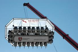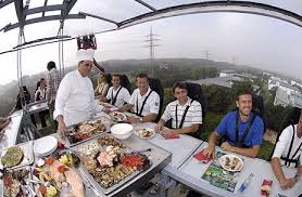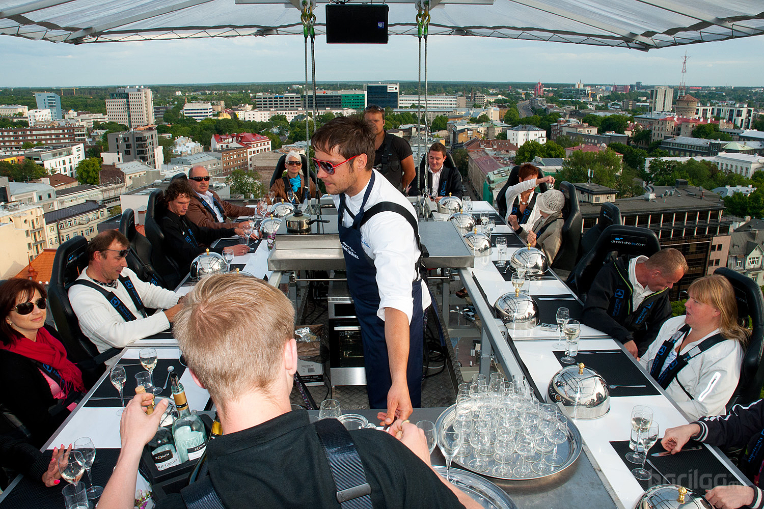 Тэгвэл агаарт тэр тусмаа 50 метрийн өндөрт оройн зоог баривал ямар вэ? Боломжгүй зүйлийг бодит болгосон “Агаарын оройн зоог” хэмээх энэхүү ресторан нь 9 м урт, 5 м өргөн тавцан бүхий ширээг 120 тонны краны тусламжтай газраас 40, 50 метрийн өндөрт өргөн үйлчилгээ явуулдаг. Нийт 22 үйлчлүүлэгч тойрон сууж 5 рестораны ажилтан тэнд дээд зэргийн хоолоор үйлчилнэ. Тээвэрлэх шаардлагатай үед энэхүү тавцан бүхий ширээ нь 2.5 м өргөн, 6 м урт болон эвхэгдэх боломжтой. Ширээнд хүмүүс суугаагүй нөхцөлд 5 тонн жинтэй бөгөөд нийт 7 тонны даацтай.