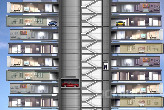Давхар болон давхруудын хооронд байх 48 ширхэг хэвтээ тавцангууд нь машины зогсоол болох төдийгүй салхины эрчим хүчийг цуглуулах сэнстэй байдаг.