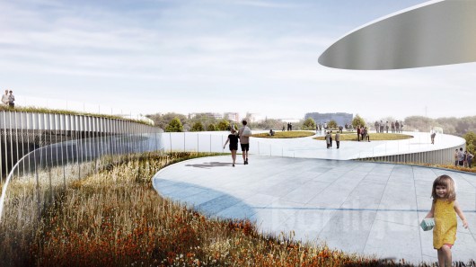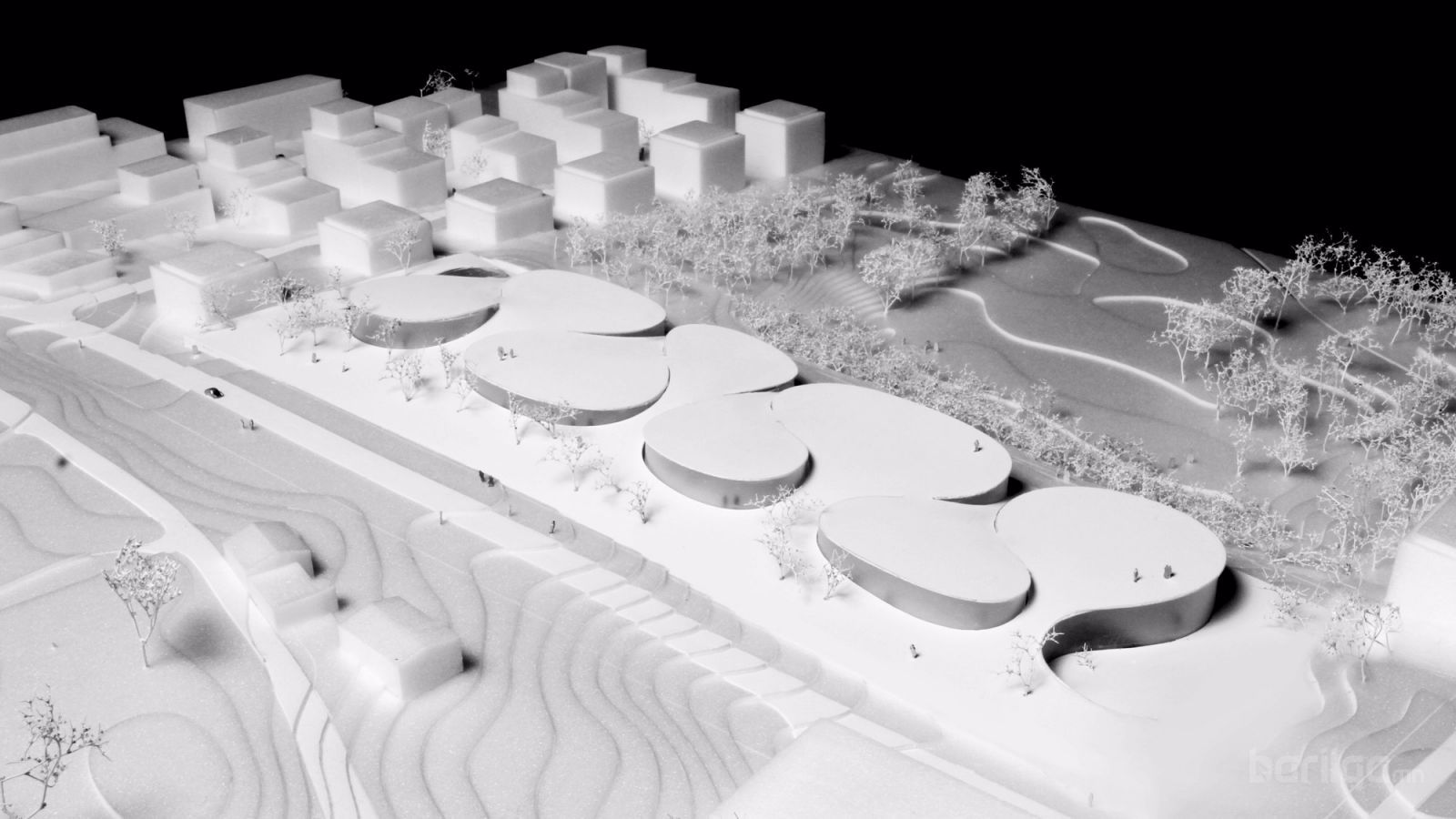 Bjarke Ingels-ийн тайлбарласнаар: Нийлшгүй бодисууд болох “тос ус” 2 холилдсон юм шиг явган хүний зам цэцэрлэгт хүрээлэнгийн хөрс ижил түвшинд байрлана.Уг цэцэрлэгт хүрээлэн нь дээш өргөгдсөн террас хэлбэрийн байх ба харахад дан ганц павильонууд долгиолсон байдал нь өөр хоорондоо атгасан гарны хэлбэрээр илэрхийлэгдэнэ хэмээжээ.
