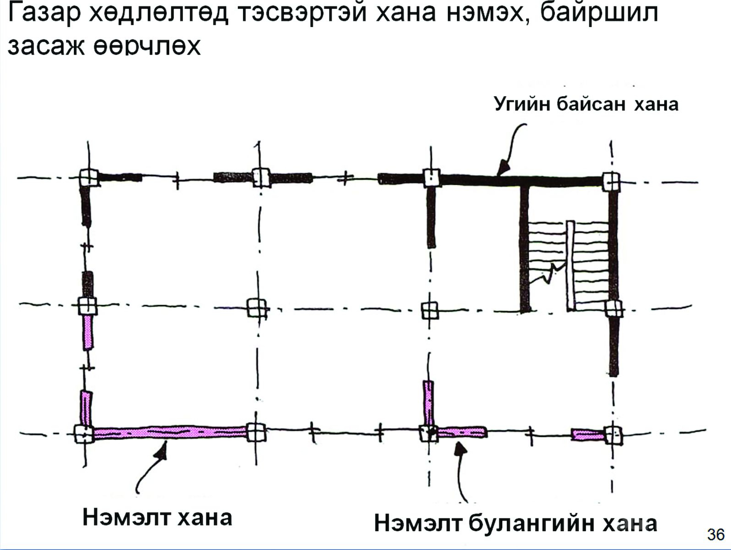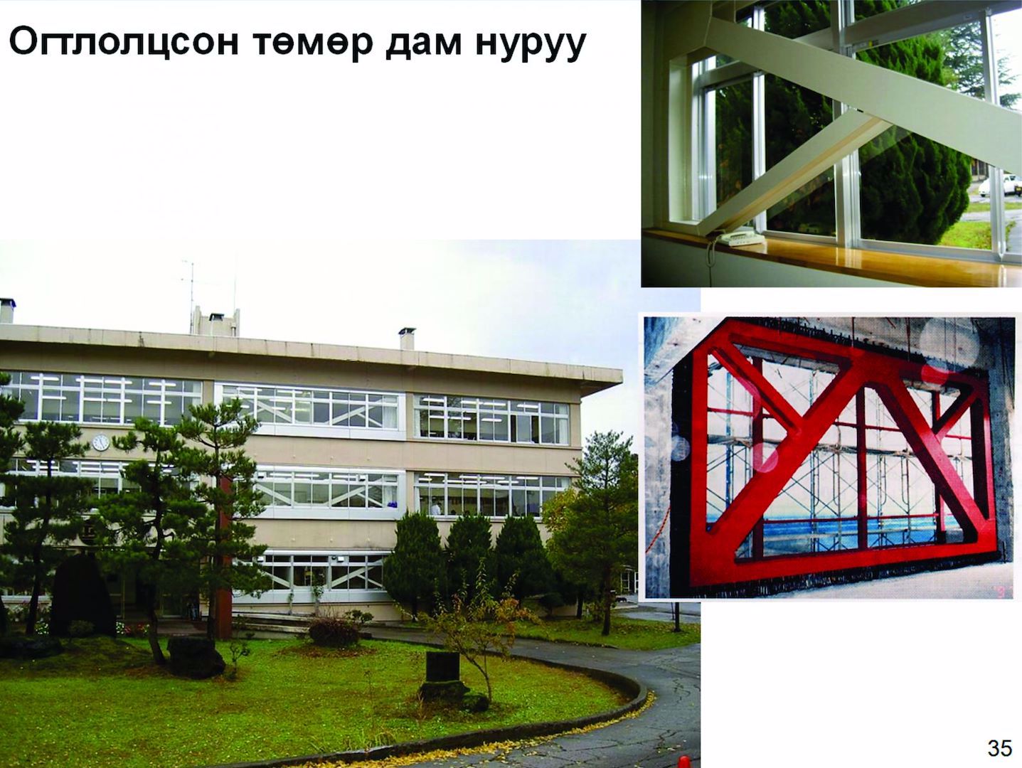 Тухайлбал, газар хөдлөлтөд тэсвэртэй төмөрбетон нэмэлт хана хийх, бүтээцийн завсартай хана нэмэх, суурь тусгаарлагч төхөөрөмж /давхарласан резинтэй/ суурилуулах, огтлолцсон дам нуруу байрлуулах, булангийн хана, дам нурууны бэхэлгээ, баганын бэхэлгээ, тулгуур хана, чичиргээ сааруулагчтай баганан бэхэлгээ, чичиргээ сааруулагчтай ташуу дам нуруун бэхэлгээ хийх гэх мэт. Ингээд засан шинэчлэх ажлын арга технологийг зургаар үзүүлье.