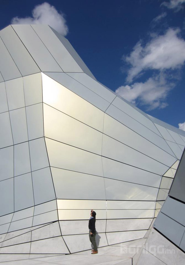Сэгсэрч, савлагдсан мэт шийдэл бүхий энэхүү ажиллах орчныг бүрэн хангасан байшин нь тусгайлан бэлтгэсэн хөндий байгууламжийг анодын аргаар боловсруулсан хөнгөн цагаан материалаар бүрэх байдлаар босгожээ. Харин уг барилгын үлдсэн ажлыг холимог болон шингэн силуэт байшинг өмнөх хэлбэрт нь тулгуурлан барьж байсан Жэкоб + Макфарлайн студи хийсэн байна.