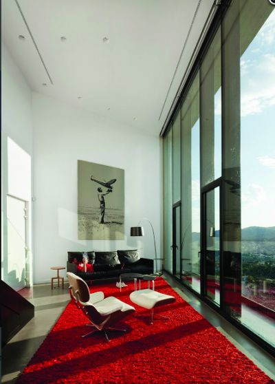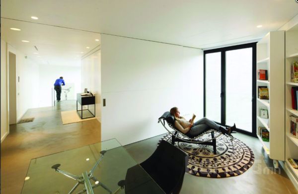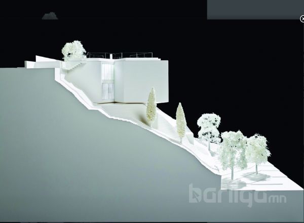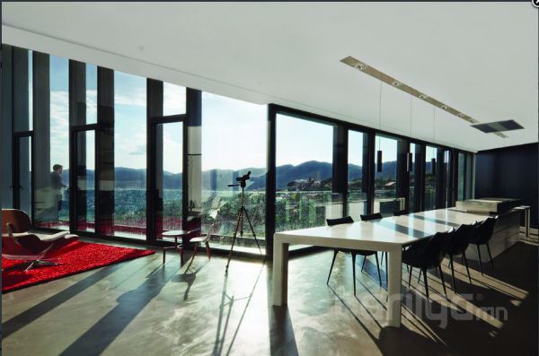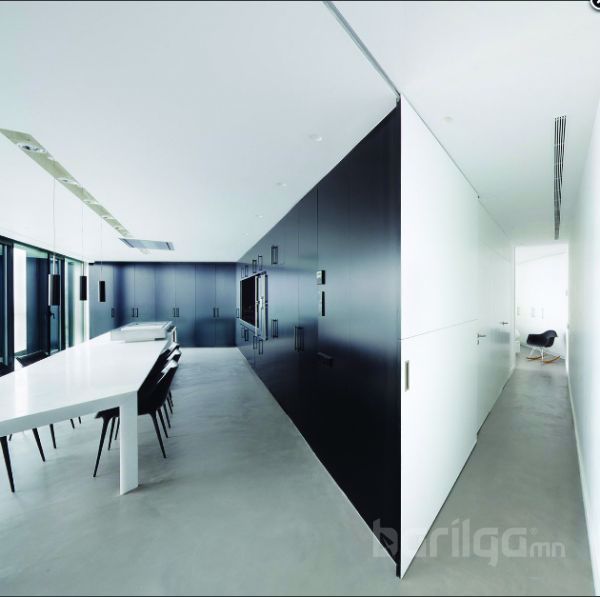 Машины зогсоолын хажуу талын дээд давхарт унтлагын өрөө, угаалгын өрөө, хувцасны болон номын өрөө зэргийг байхаар тооцсон. Доод давхрын урд талын хэсэг нь бүхэлдээ зочны өрөө байхаар тохижуулагдсан ба 8 метрийн урттай том гантиг чулуун ширээгээр гал тогоог тусгаарлажээ. Өрөөний ард талын хэсэгт эргэн тойрны байгалиа шууд харж болох талбайг гаргаж өгсөн.