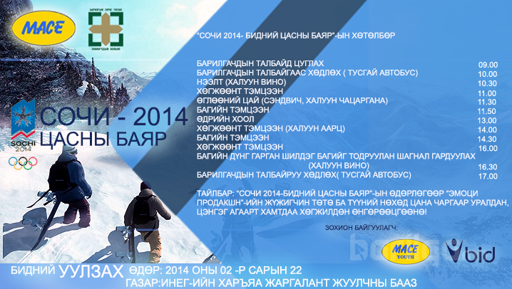СОЧИ-2014 олимпоор амьсгалж буй энэ өдрүүдэд жил бүр уламжлал болгон зохион байгуулдаг Барилгын салбарынхны цасны баярын арга хэмжээг МОНГОЛЫН БАРИЛГЫН ИНЖЕНЕРҮҮДИЙН ХОЛБОО, БАРИЛГЫН ЗУРАГ ТӨСӨЛ ЗОХИОГЧДЫН ХОЛБОО хамтран “СОЧИ-2014 ЦАСНЫ БАЯР” нэртэйгээр 2014 оны 02 дугаар сарын 22-ны өдөр ИНЕГ-ын харьяа “ЖАРГАЛАНТ”-ын жуулчны баазад зохион байгуулах гэж байгаагаа дуулгахад таатай байна.