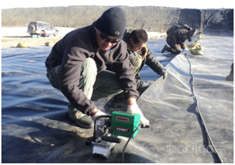 Leister Comet машинаар геомембраныг нааж байгаа техникч болон түүний өмнө ирмэгүүдийг арчиж байгаа арчигч.