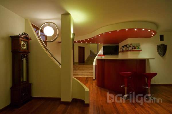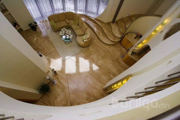 Тэрээр барилгаа төлөвлөхдөө хурц өнцөг бага, саруулхан зайтай байхаар шийдэж өгчээ. Гол нурууг халхлах долгиолсон элдэв хэлбэрүүд, цэлгэр талбай, хачин жигтэй ч загварлаг шийдлээр хийгдсэн уг байшингийн нэг давхрыг бүхэлд нь амарч тухлахад зориулсан. Өндөр тааз нь өрөөг асар том болгохын сацуу дугуйрч долгиолсон шат ч бүхэлдээ харагдаж байхаар тооцоолжээ.