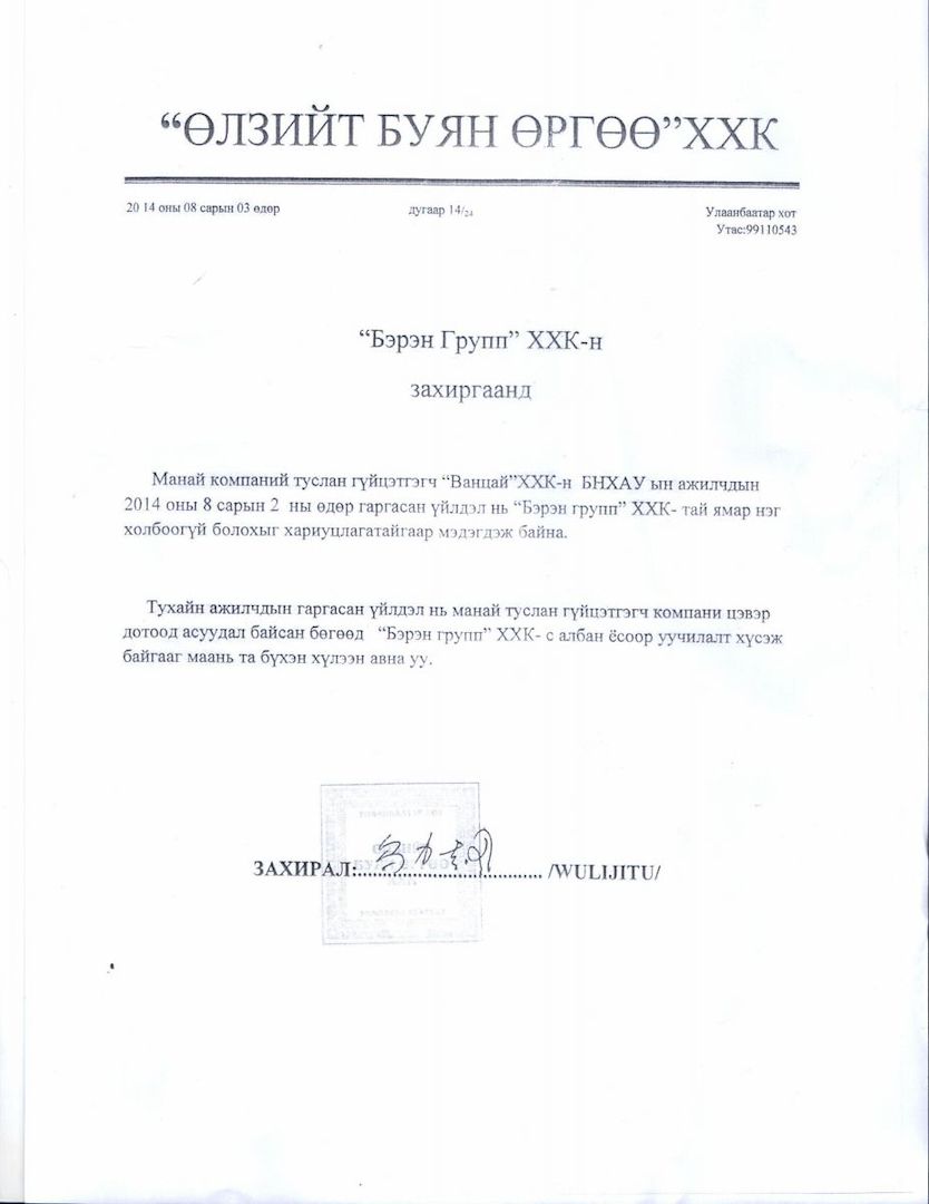 “Өлзийт Буян” ХХК нь “Бэрэн” ХХК-ний Сүхбаатар дүүргийн 7-р хороонд баригдаж буй барилгын угсралтын ажлыг гэрээлэн хийж байсан байна. Хятад иргэдийн цалинг өгөөгүй нь “Өлзийт Буян” ХХК. 8 сарын 02-ны өдрийн хятад ажилчдын гаргасан үйлдэл нь“Бэрэн” ХХК-д ямар ч холбоогүй гэсэн мэдэгдэл хүргүүлсэн байна.