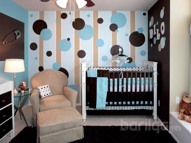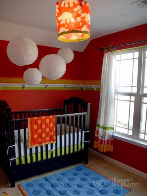 Тод өнгийн тойргыг том жижиг хэмжээтэйгээр хананд урлаж өгсөн байна. Хүүхэд тод өнгийн зүйлийг харах сонирхолтой байдаг. Бэлэн зүйлээр хүүхдийнхээ өрөөг тохижуулаад зогсохгүй иймэрхүү бүтээлч байдлыг нь тусгах хэрэгтэй. Ор хөнжлийн даавууны өнгөтэй хослуулж ханыг нь будсан байгааг анзаарч байгаа байх.