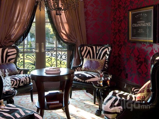 Ягаан Зебра өнгийн сандлаар гангарсан Ажил хэрэгч эрчүүдийн өрөөний дизайныг танилцуулж байна. Бараан өнгийн хананы голд гуулин хүрээнтэй жаазыг байрлуулсан донж нь таарчээ. Цонхыг тансаг зэрэглэлийн даавуун хөшгөөр чиж өгсөн нь бүүр чамин харагдуулж байна.
