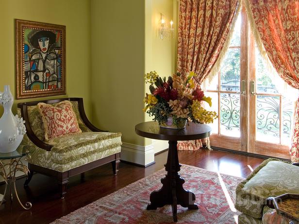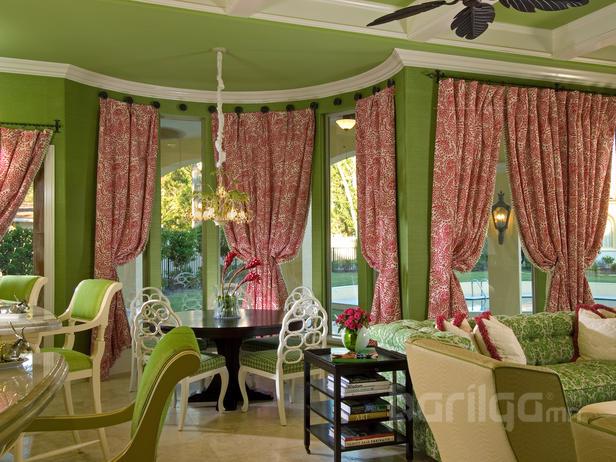 Зочны өрөөнд даавуун хөшиг өнгөлгөөнүүдийг тусгаж өгснөөр шинэ сэргэг мэдрэмжийг өгдөг. Цайвар ногоон өнгөтэй ханан дээр сууц эзэмшигчийн дуртай ягаан өнгийг хослуулж өгснөөр өрөөнд байгаа тавилгууд ялгарч харагдаж байна. Мөн камин зуунхны цаад талын ваар, кофены ширээ, шилэн хийцтэй өвөрмөц хийцлэлтэй тавилгууд нь өрөөг гоёмсог харагдуулж байна.